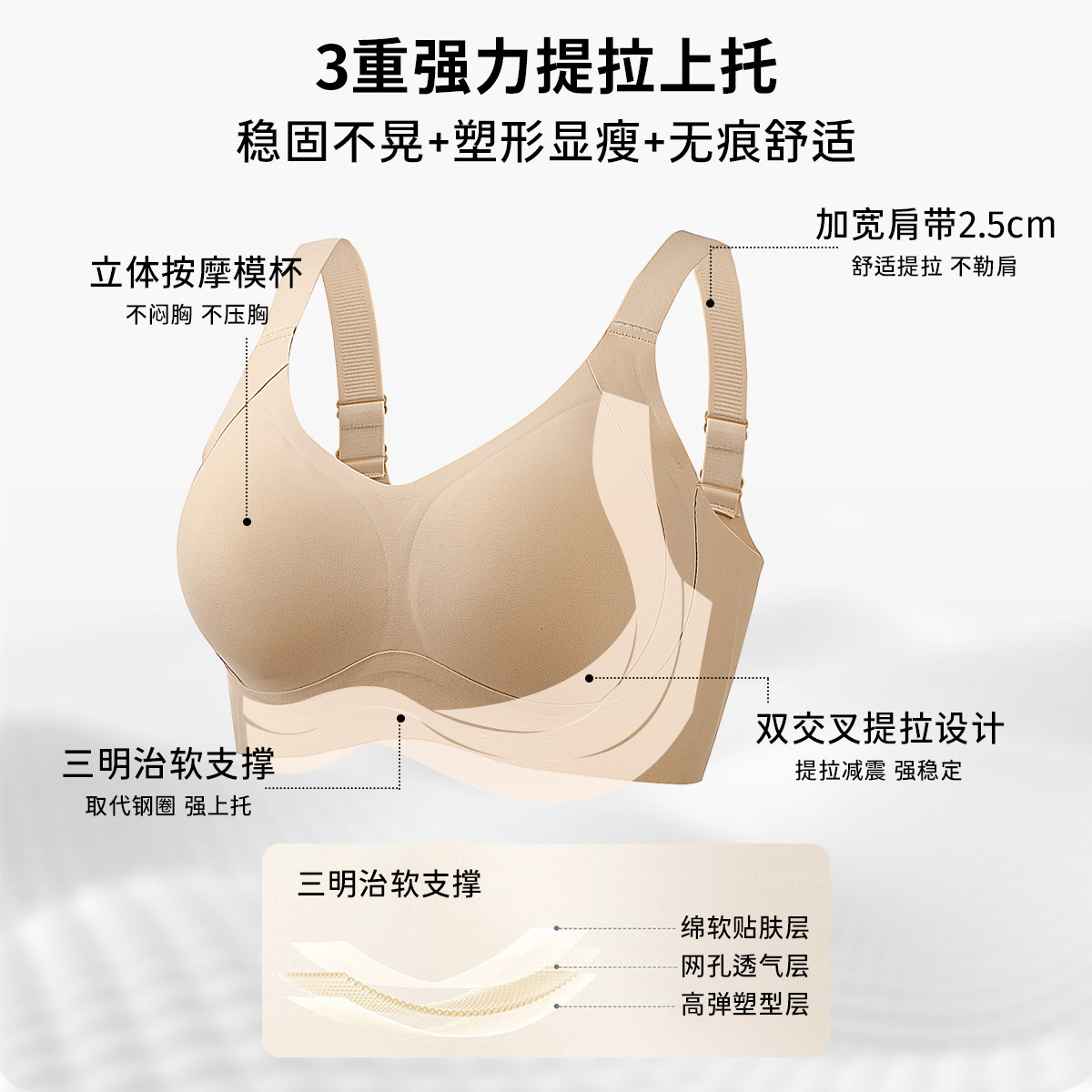 润微提拉女王内衣女大胸显小无痕大码调整防下垂收副乳粉底液文胸