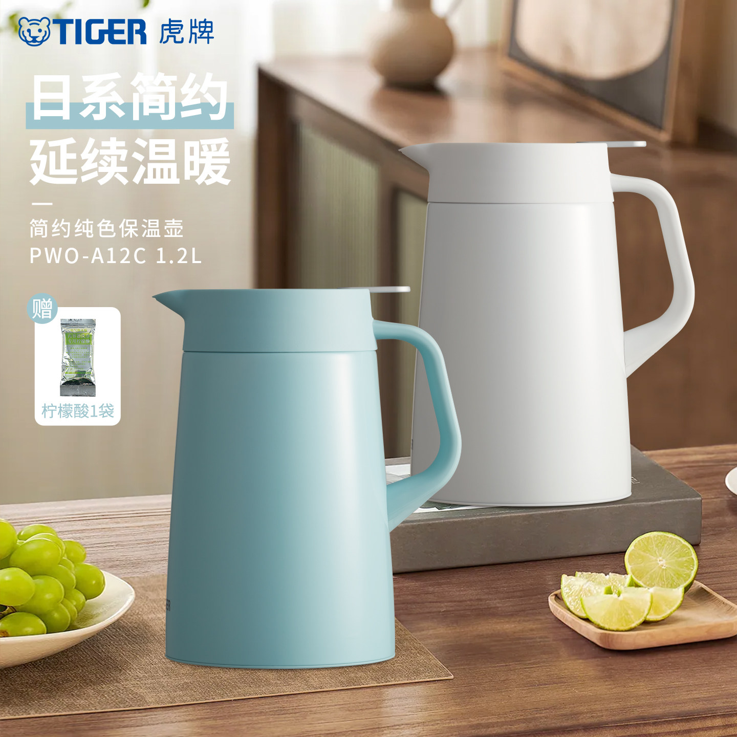 tiger虎牌PWO-A12C不锈钢保温壶家用简约纯色便携保暖热水壶1.2L