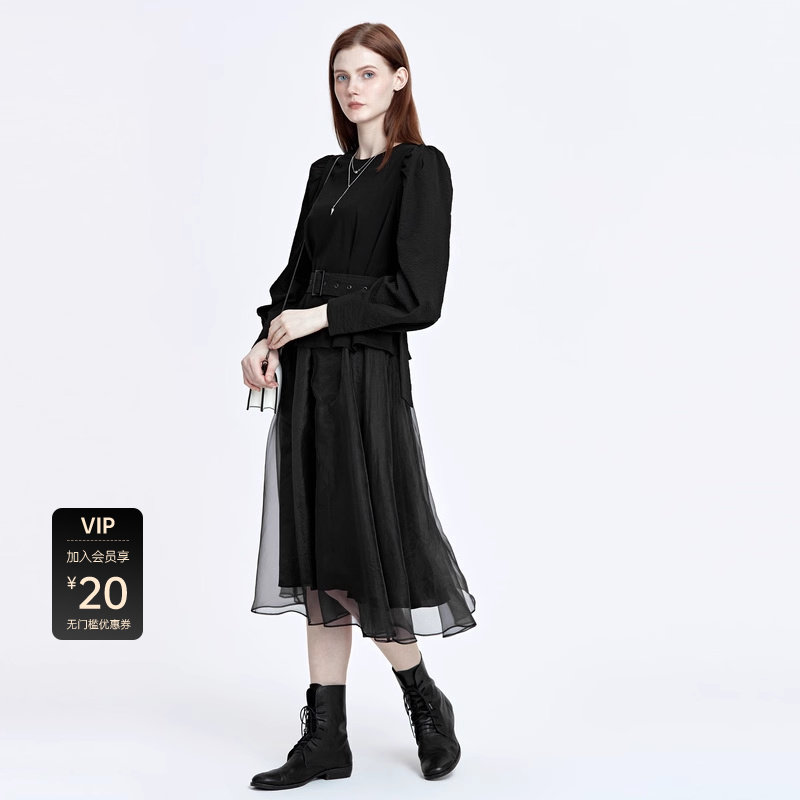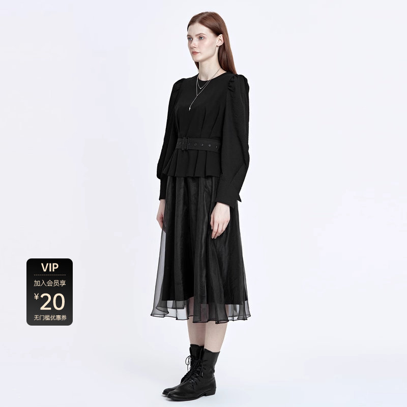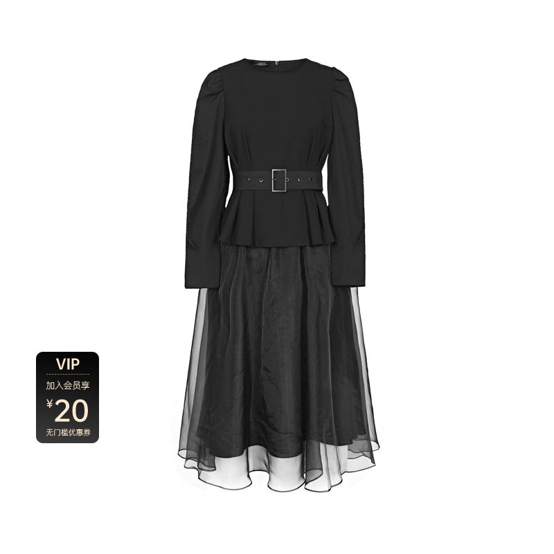 两件套连衣裙 抽褶收腰 网纱裙摆