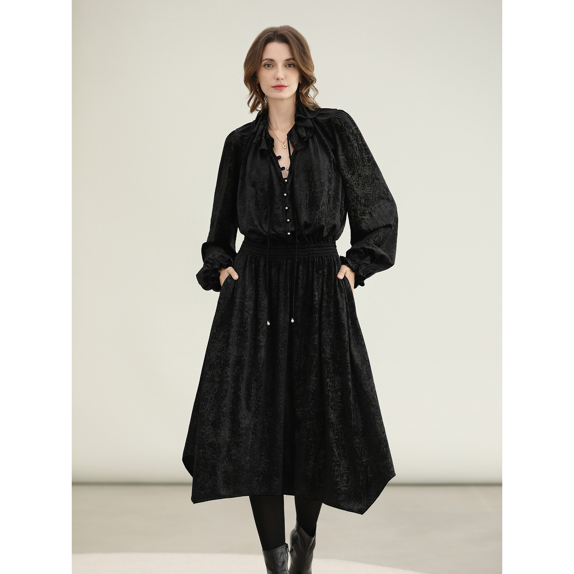 COCOBELLA复古压花烫金丝绒连衣裙荷叶收腰内搭长裙FR3239-2
