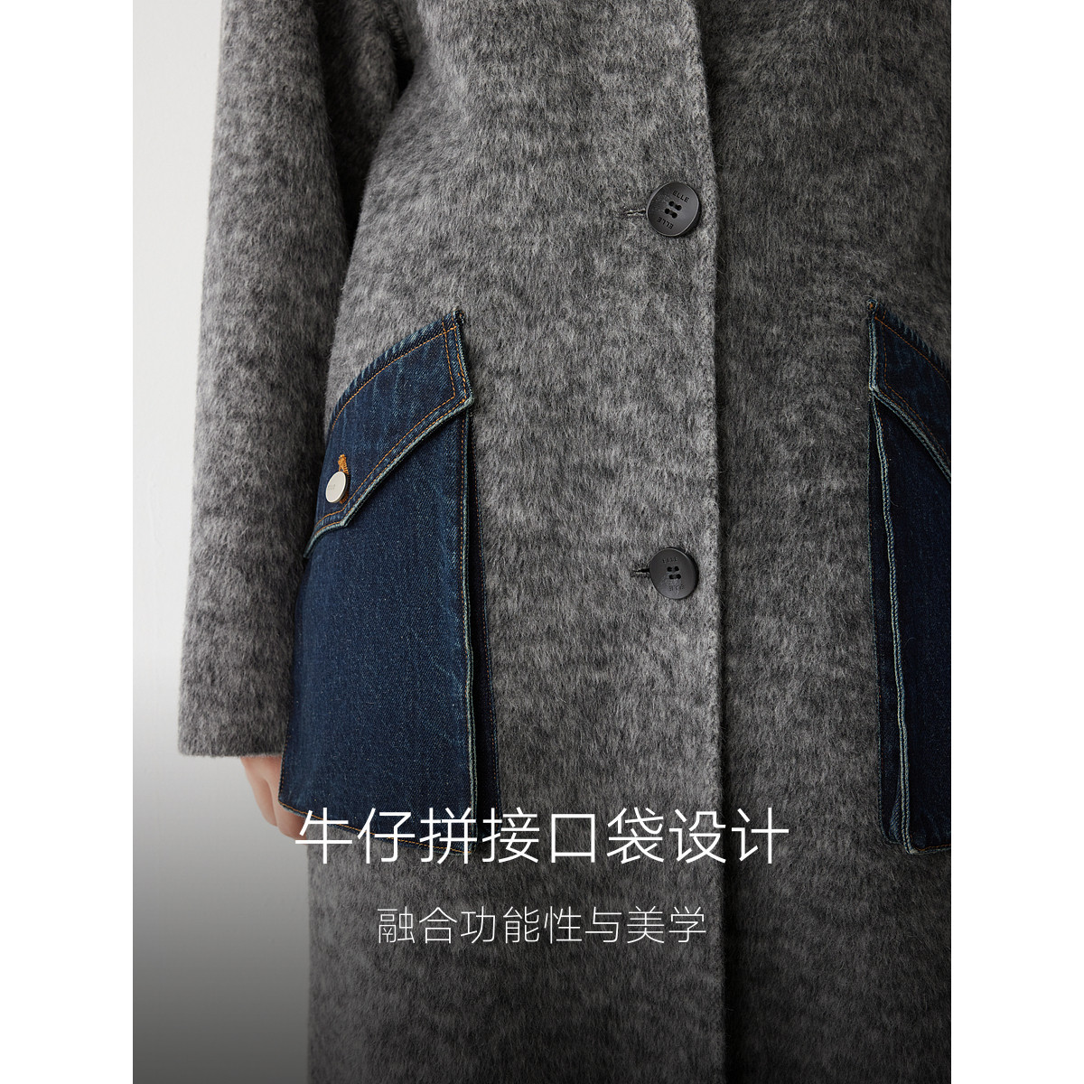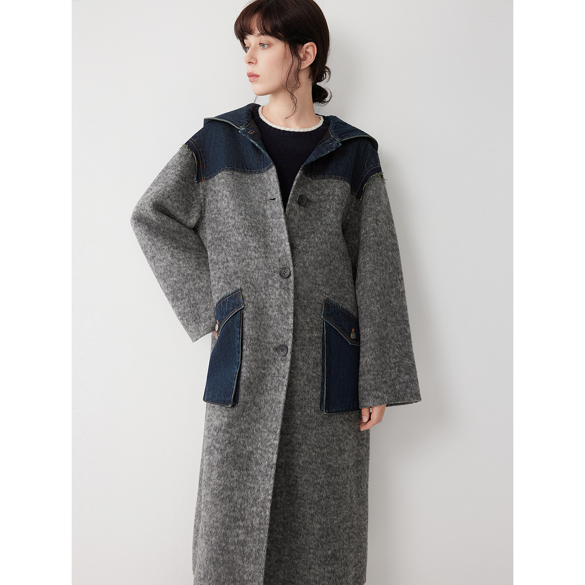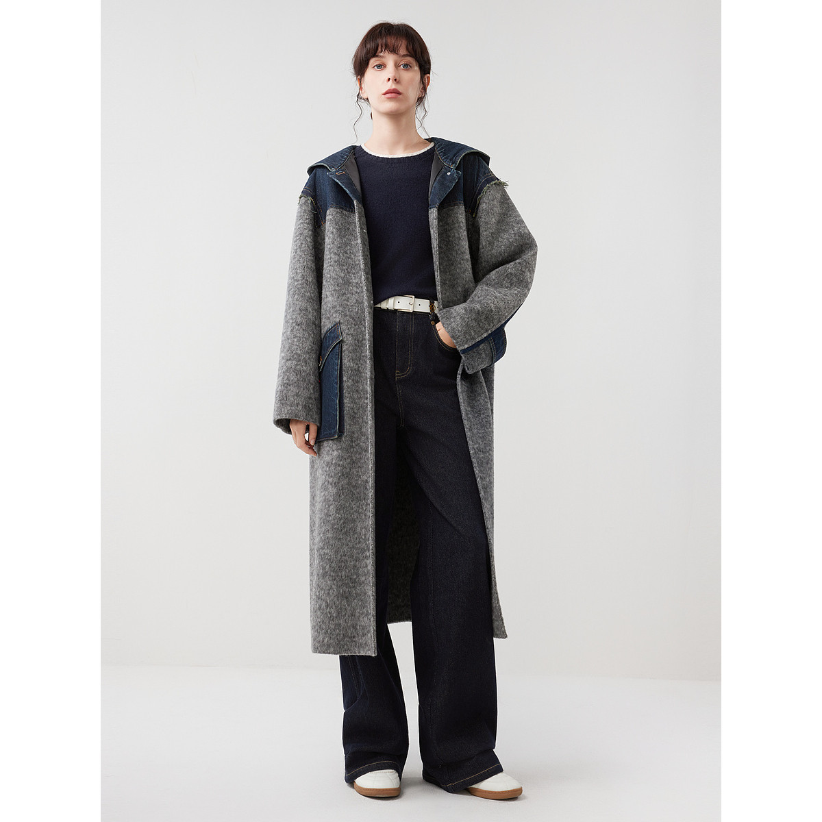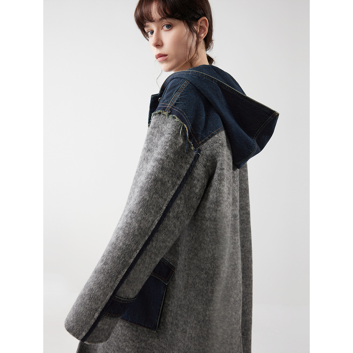 ELLE法式牛仔拼接连帽长款双面呢大衣女2025冬季新款宽松毛呢外套