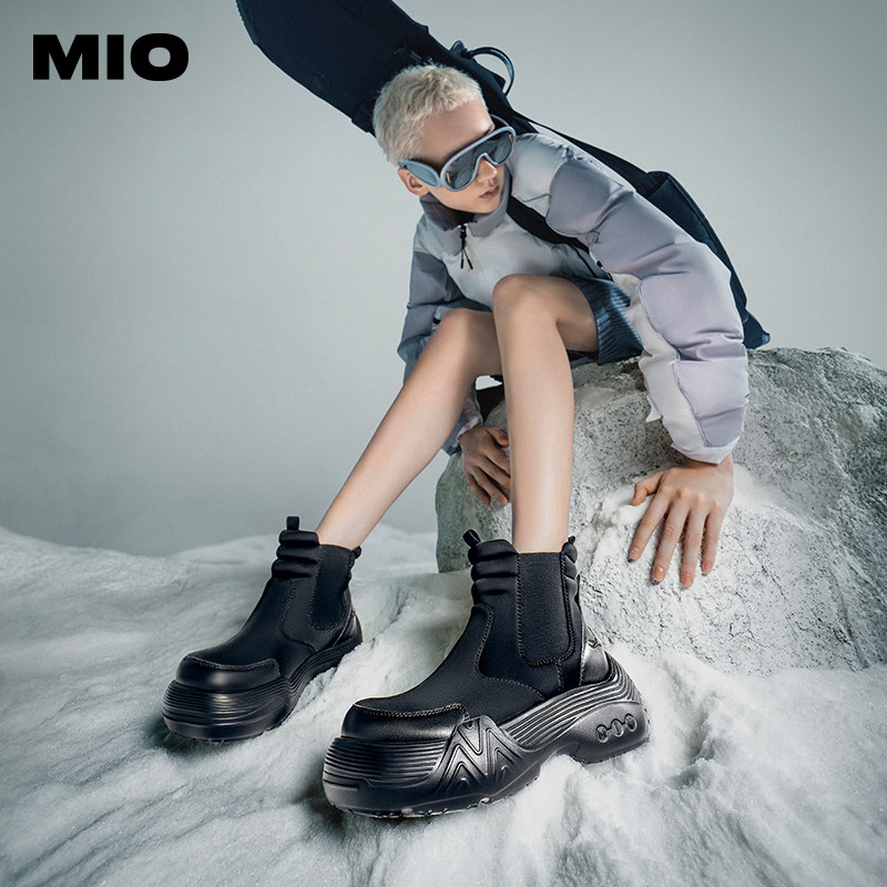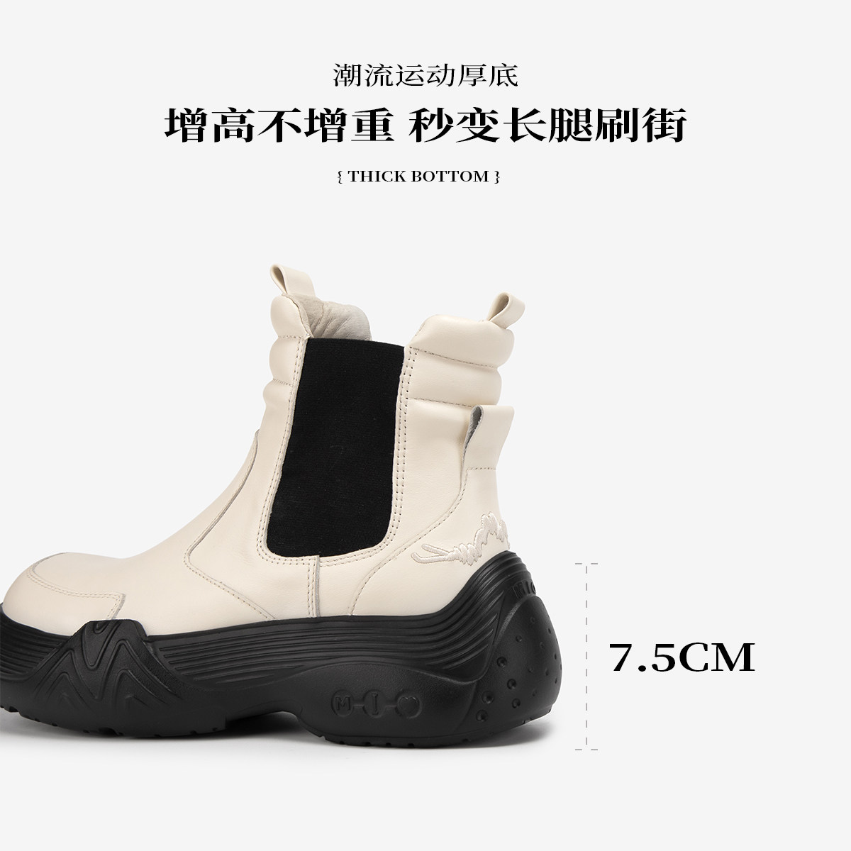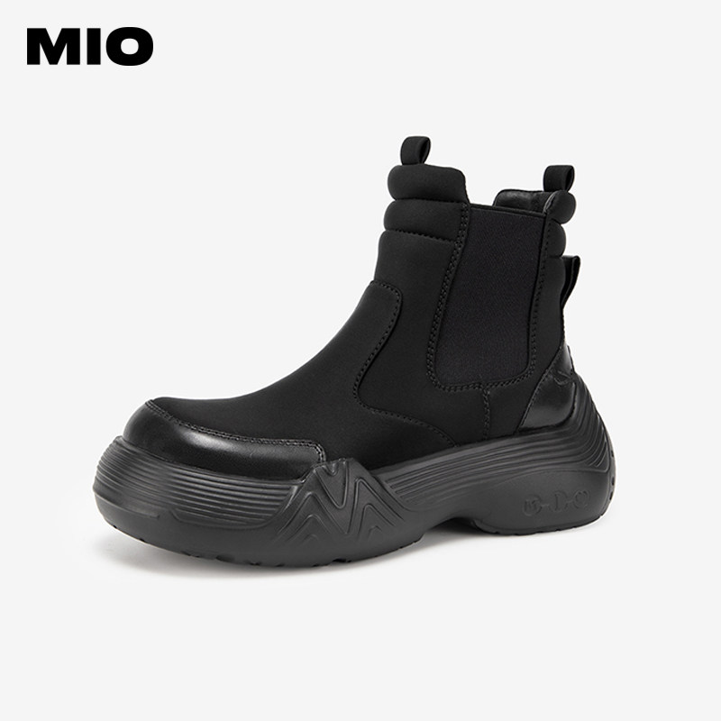 MIO米奥靴子女冬季圆头高跟厚底切尔西靴纯色百搭潮流黑色短筒靴