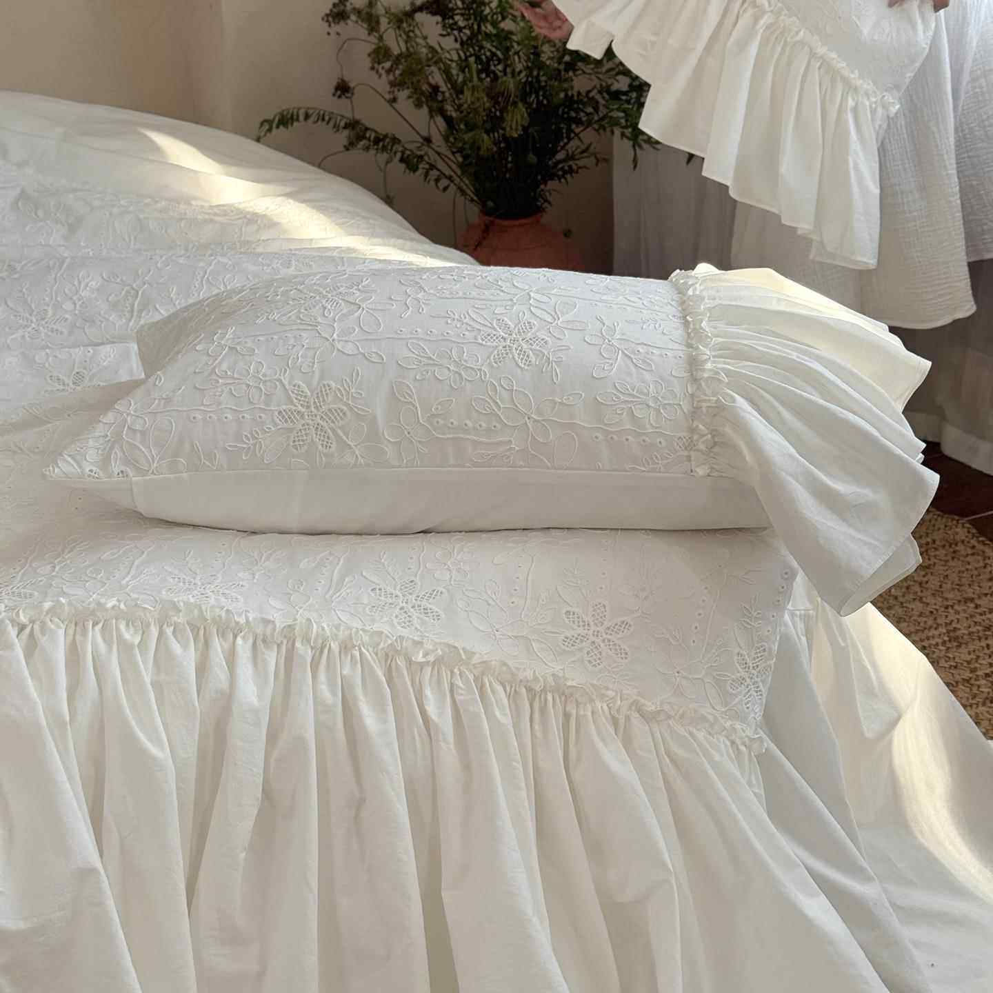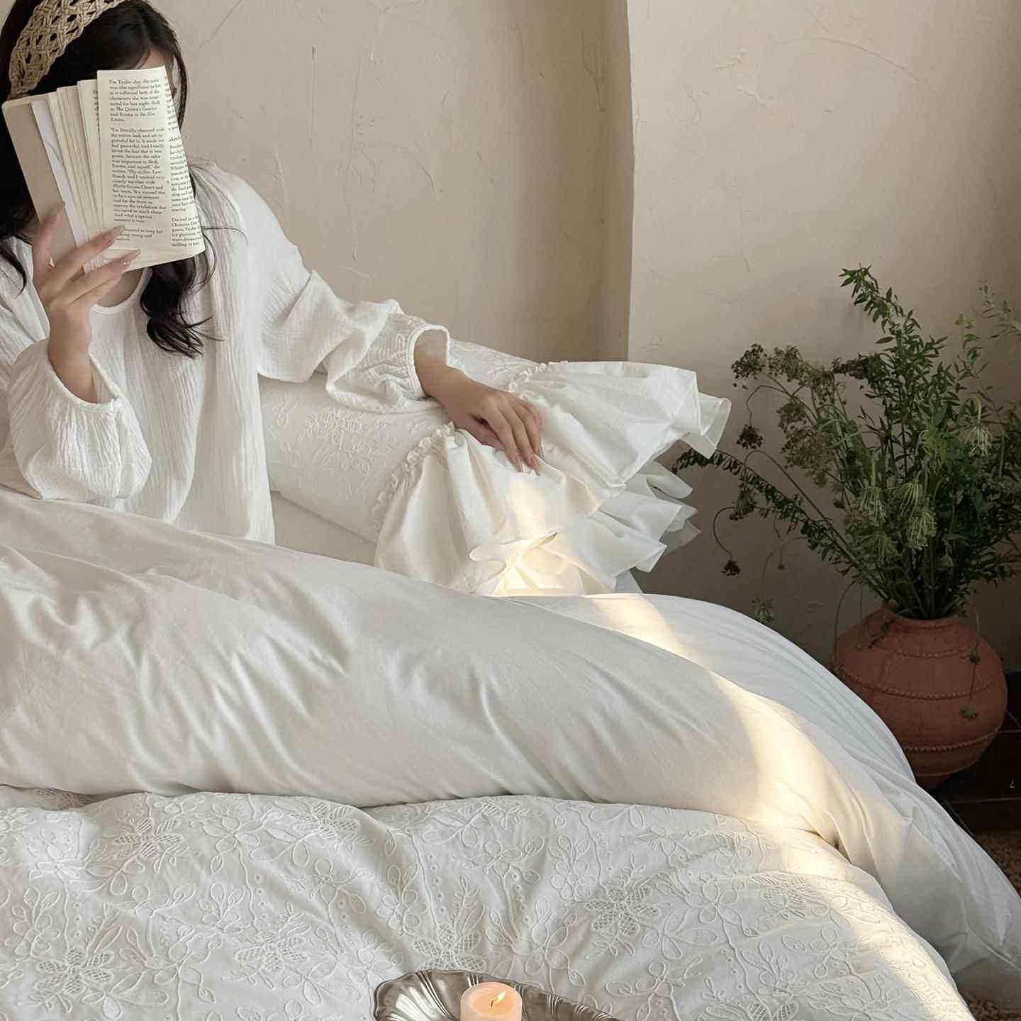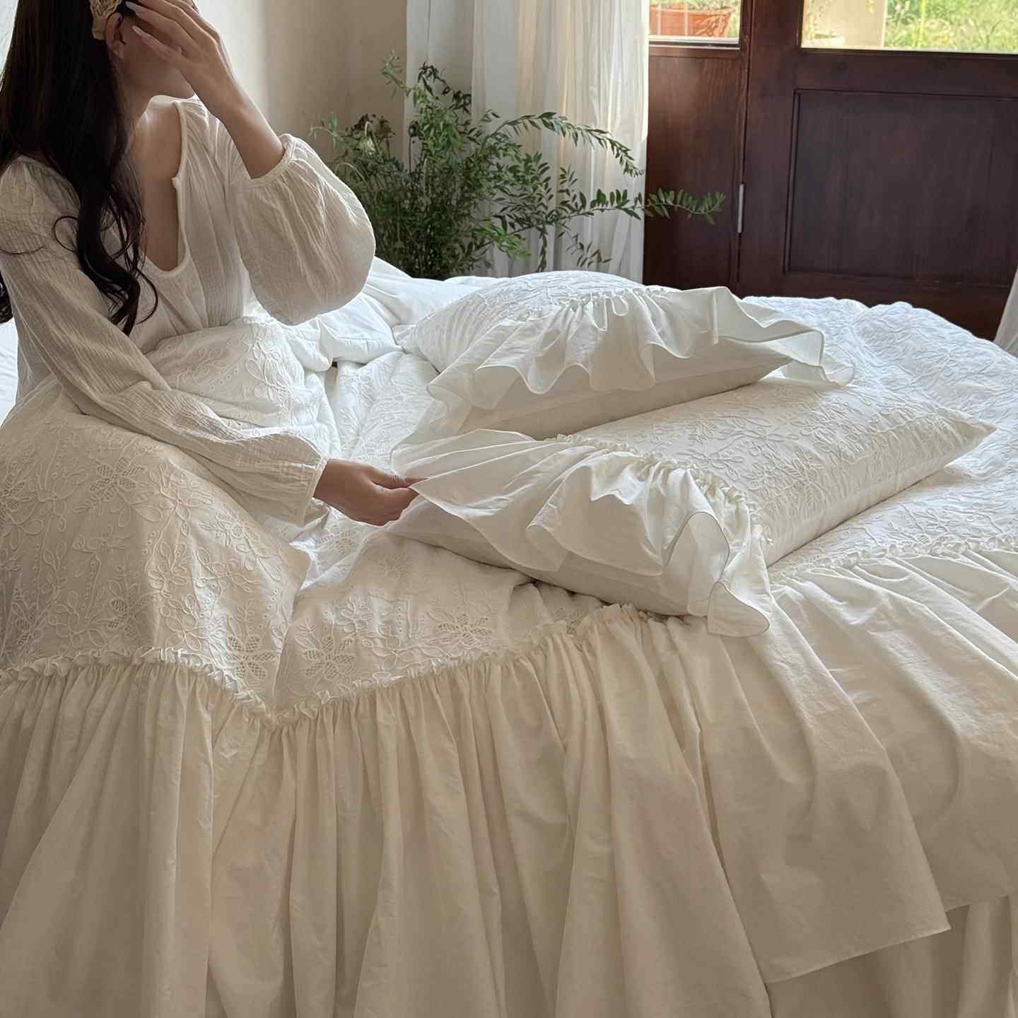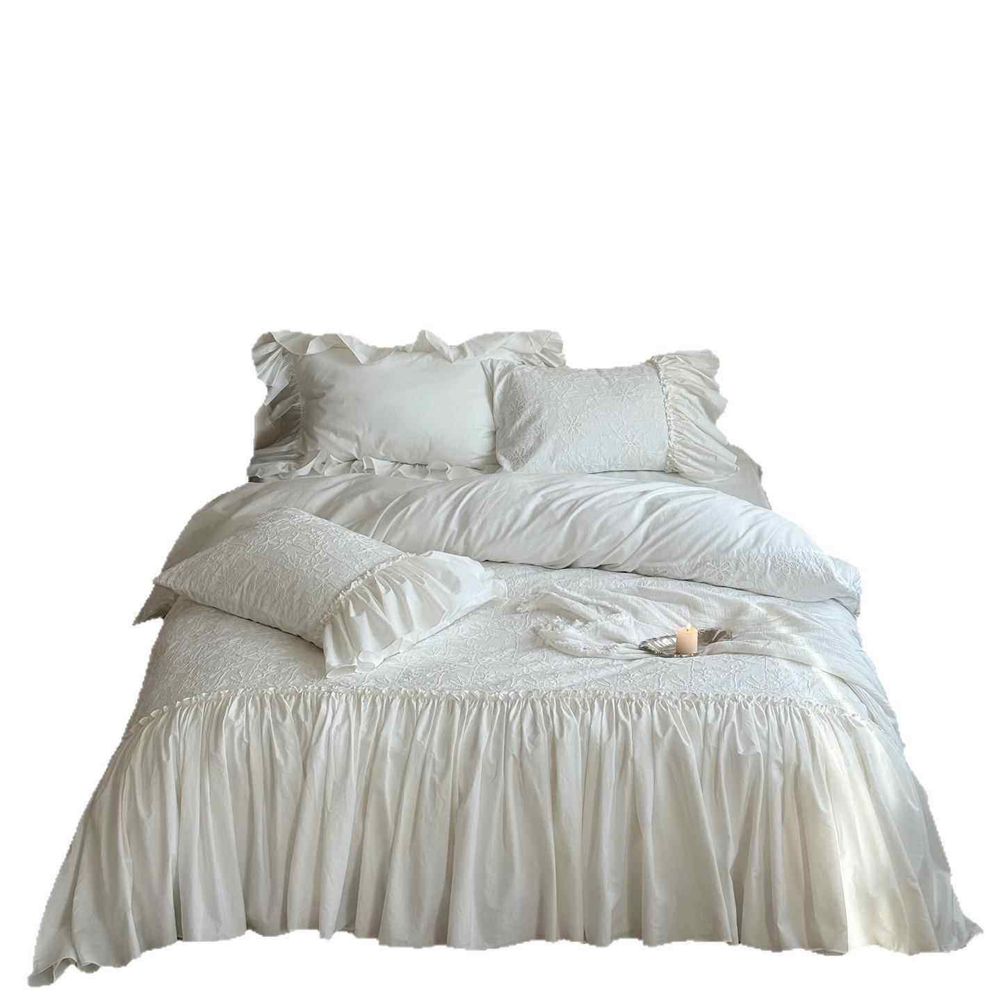 法式轻奢白色全棉水洗棉床上四件套公主风纯棉花边被套床裙少女心