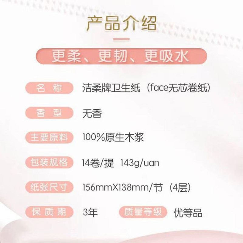 洁柔无芯卷纸粉face2000克14卷家用实惠学生卷筒纸卫生纸木浆原生