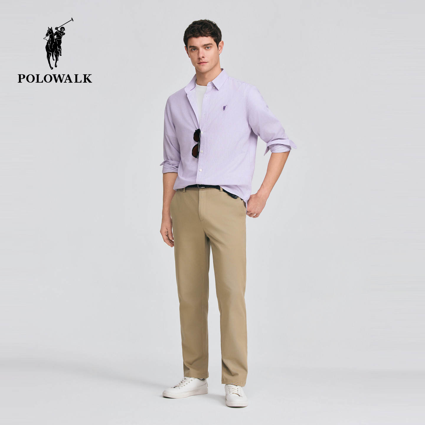 POLOWALK男式长袖衬衫2026春季新品亚麻混纺纽扣领细条纹通勤衬衫