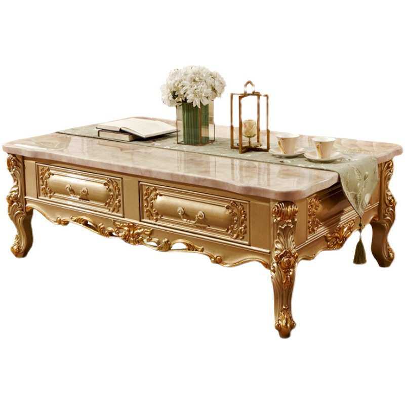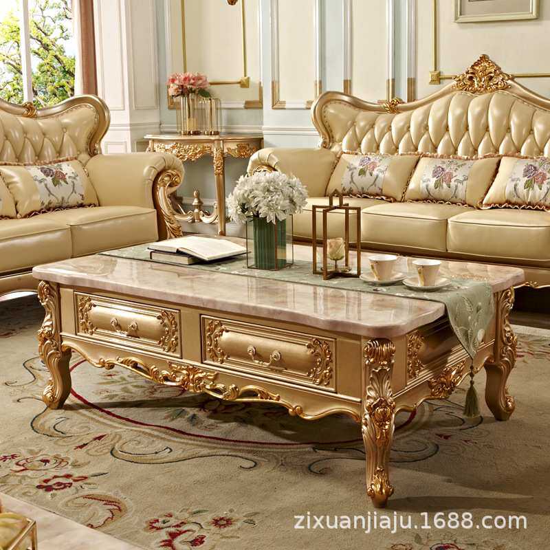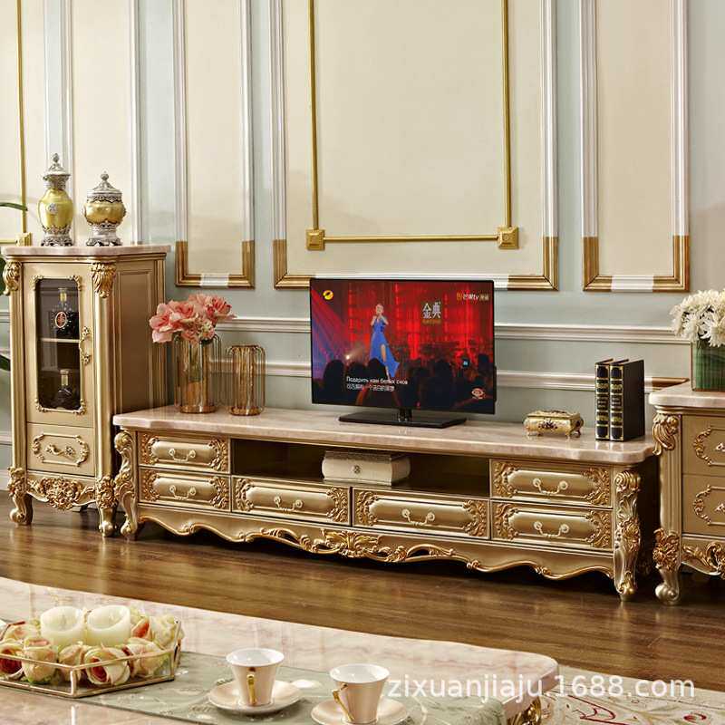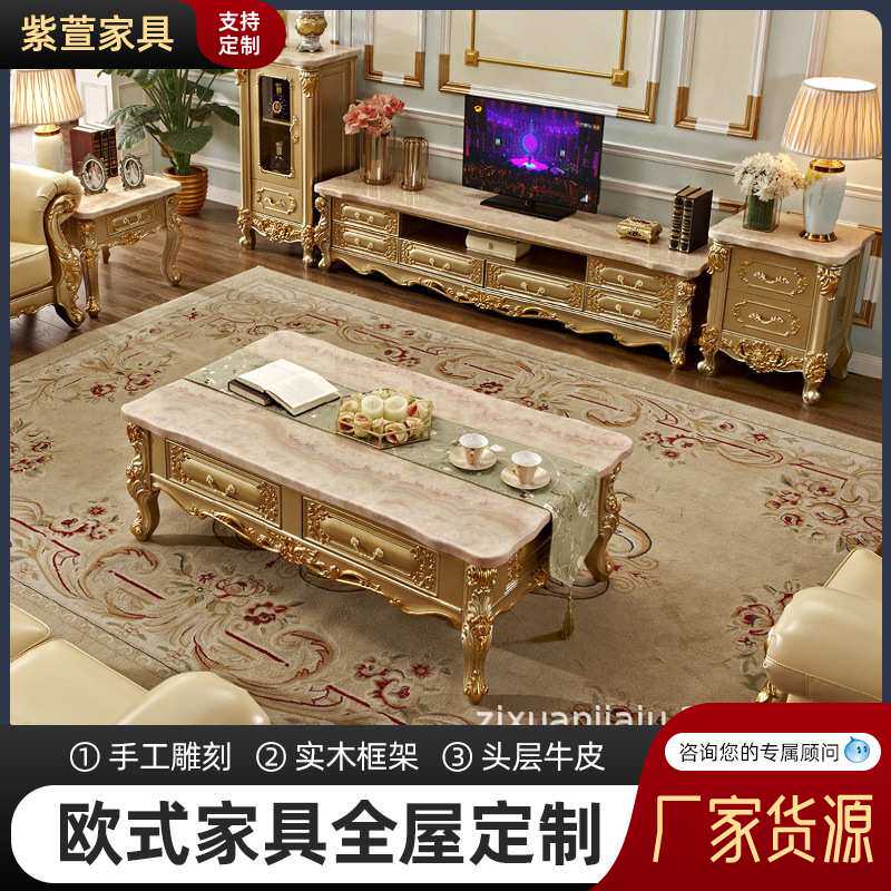 紫萱家具 欧式高档茶几电视柜组合 实木雕刻大理石茶桌香槟金色