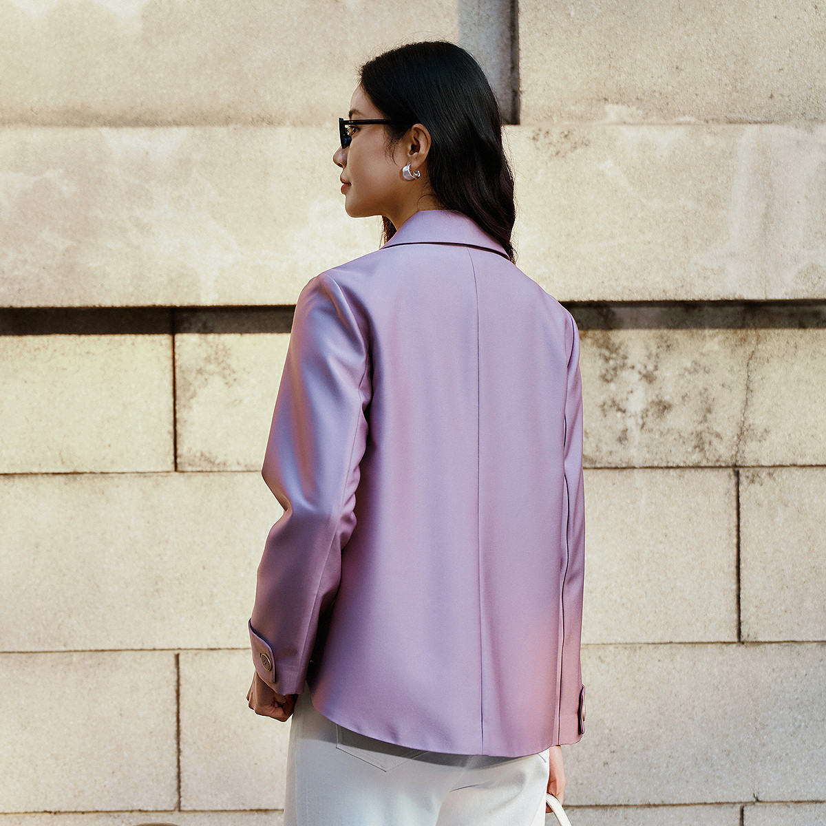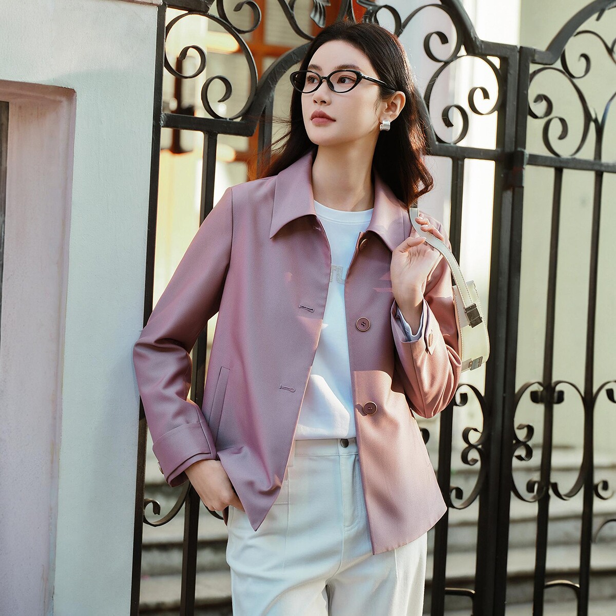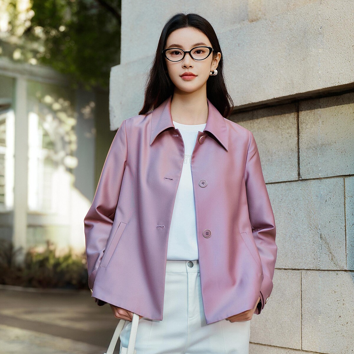 FINITY菲妮迪短款风衣2026年春季新款简约紫色亮皮防风通勤外套女