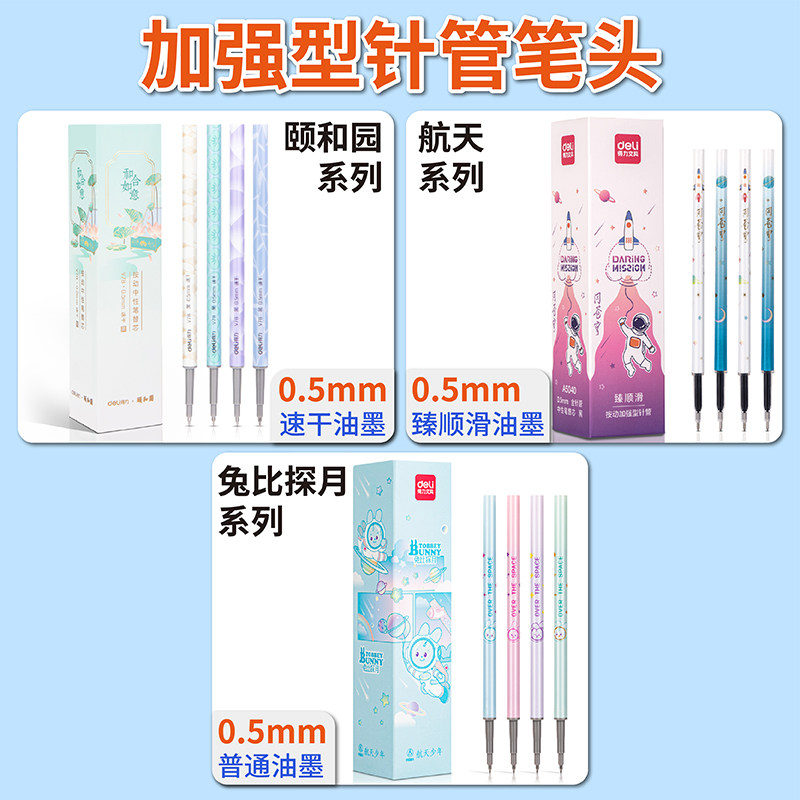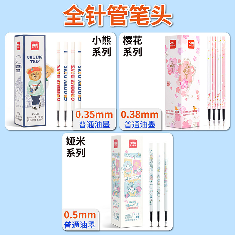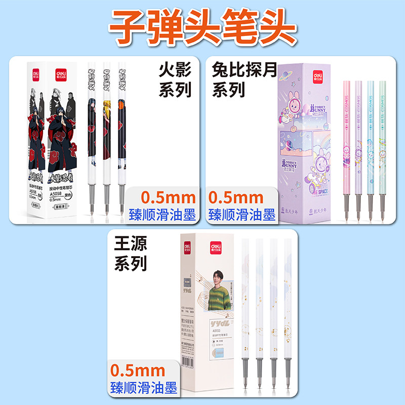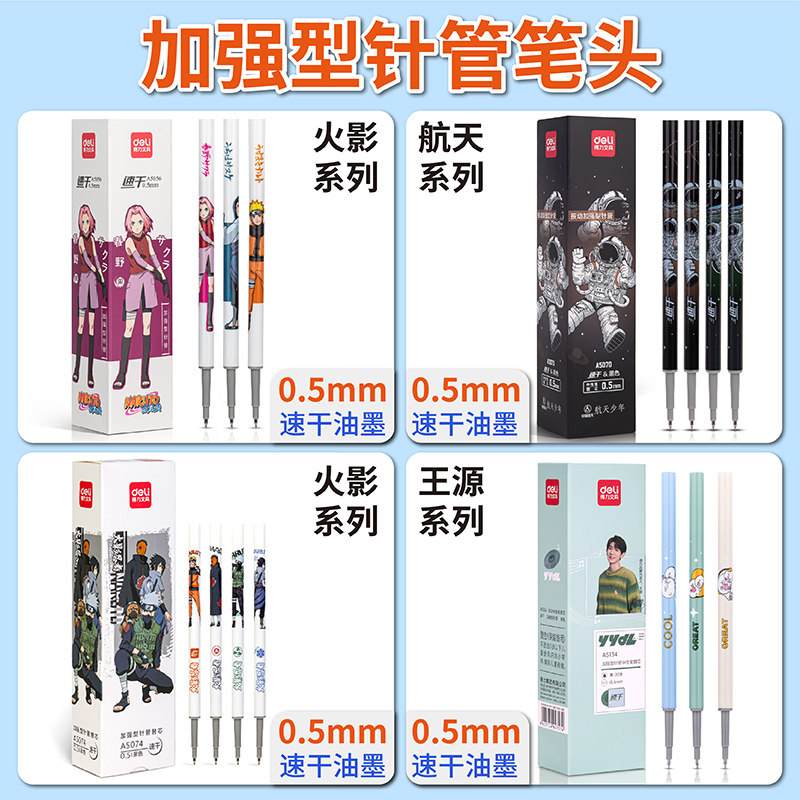 得力按动式笔芯按压火影忍者问苍穹卡通中性笔替芯加强型针管0.5子弹头黑色全针管学生考试办公书写水笔笔芯