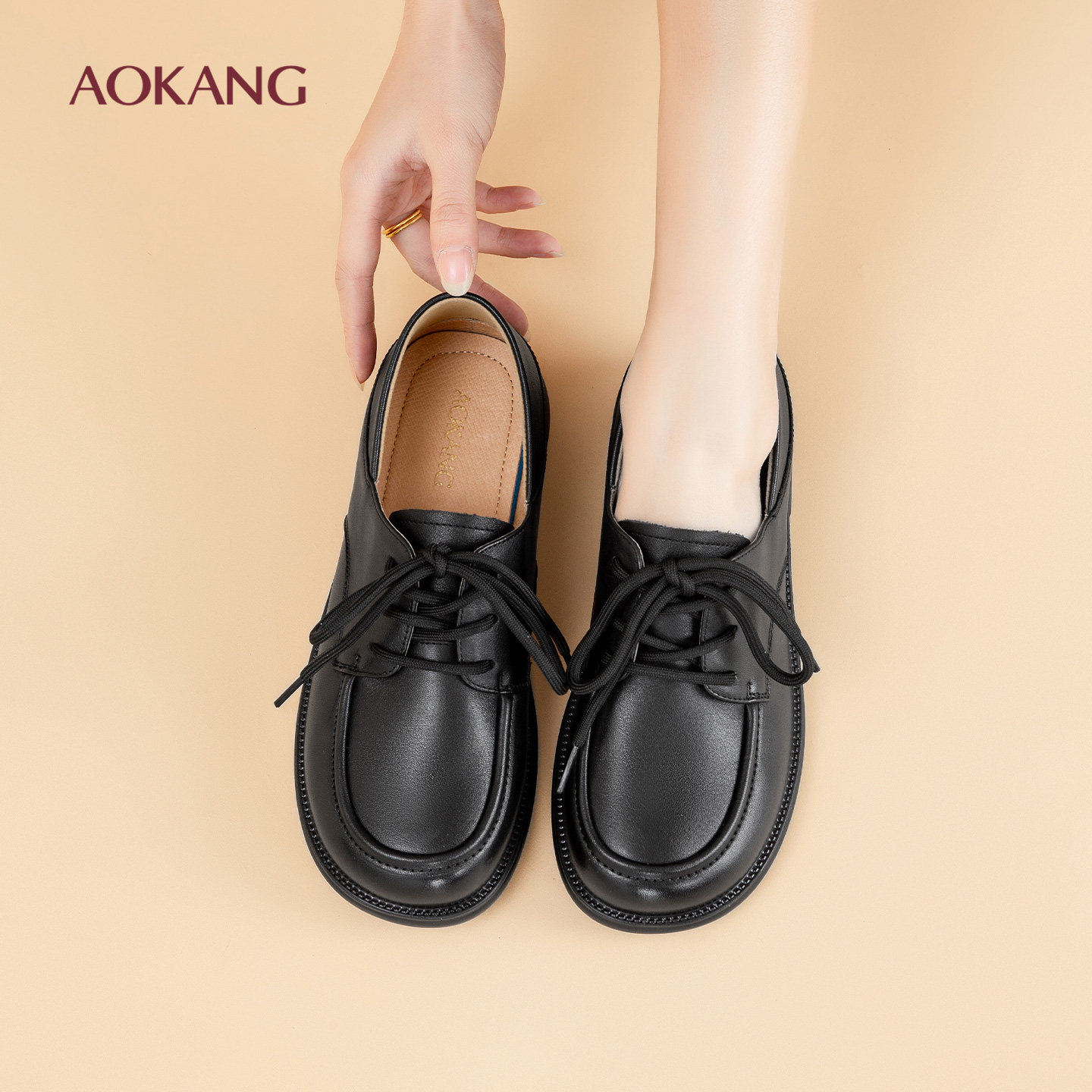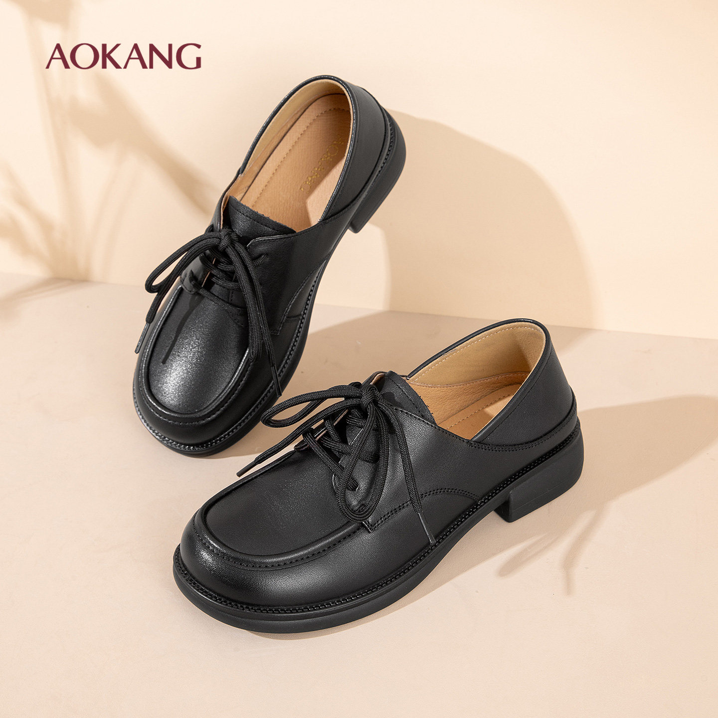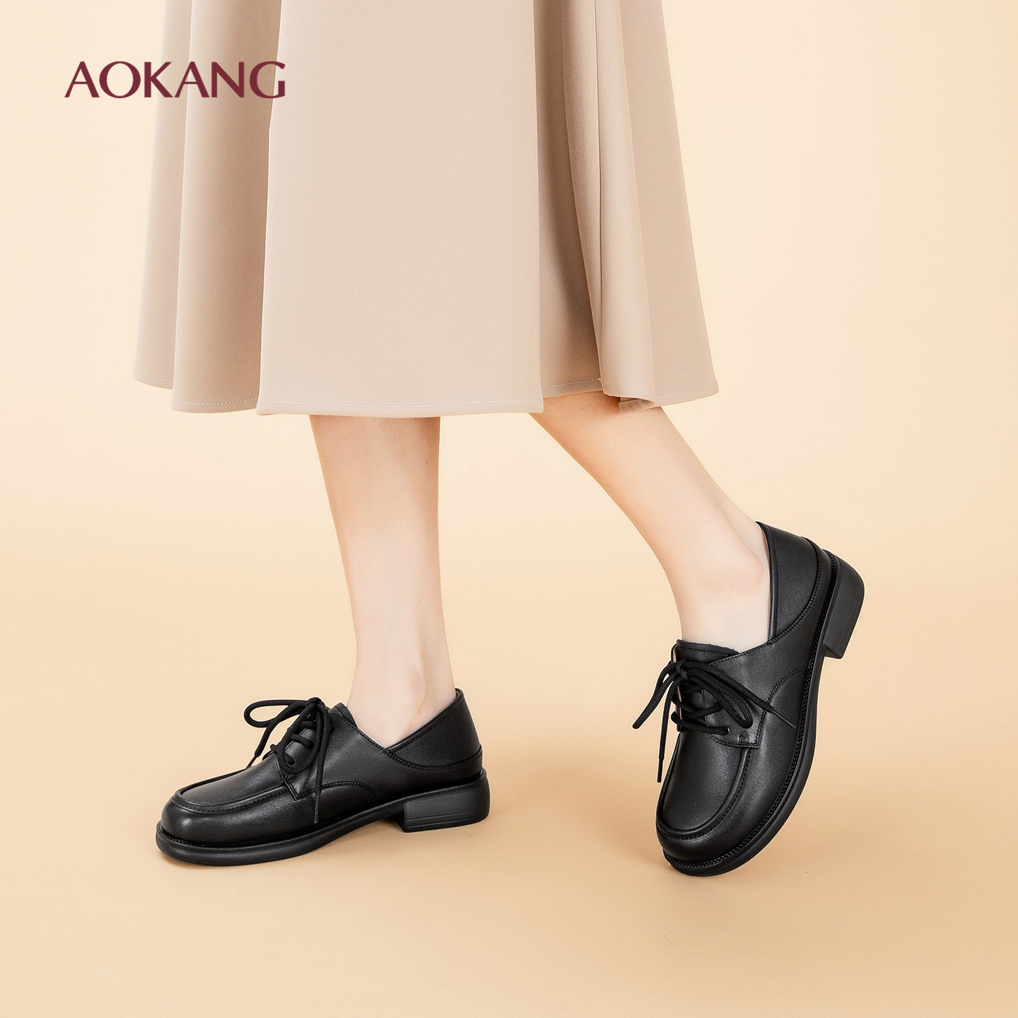 奥康 女鞋2026春季新款真皮软底乐福鞋粗跟系带通勤单鞋N