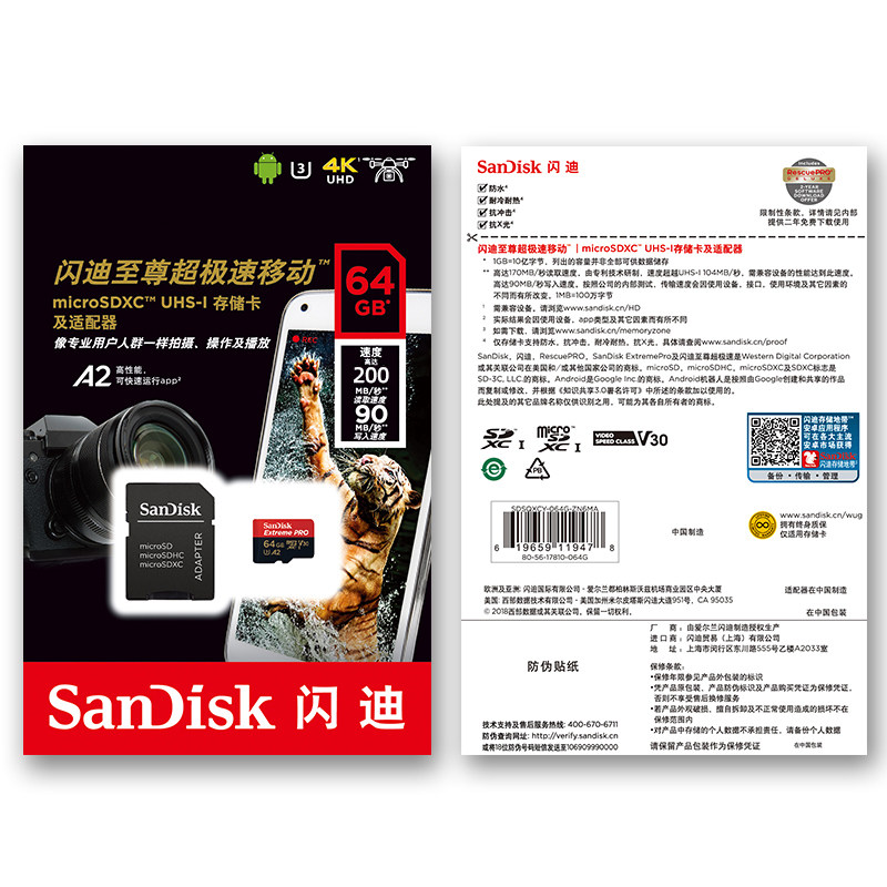 闪迪64G高速TF卡micro sd卡手机内存卡无人机卡运动相机卡存储