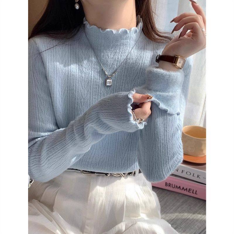 白色加绒打底衫女秋冬季大码内搭毛衣加厚一体绒木耳边半高领上衣