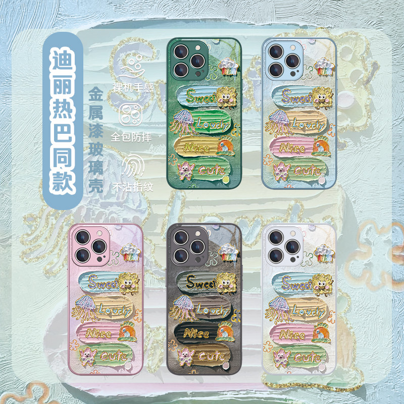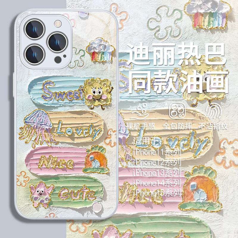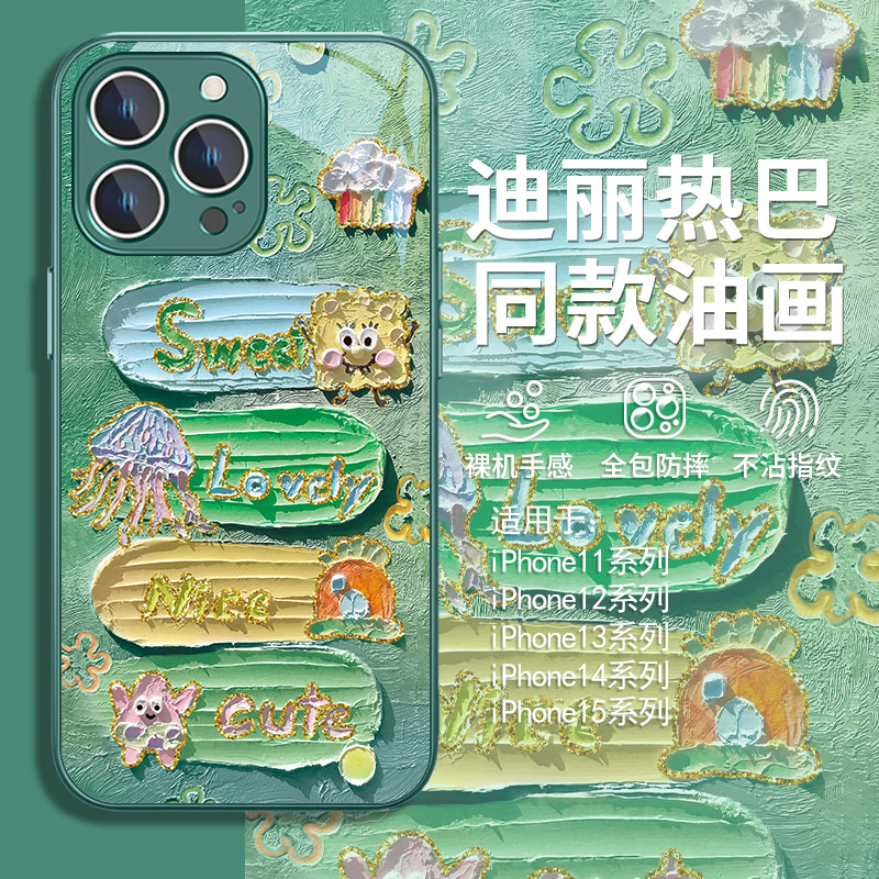 适用苹果17promax油画派大星手机壳iPhone15plus/14迪丽热巴同款13pro水母11可爱12mini动漫8plus菠萝屋x玻璃