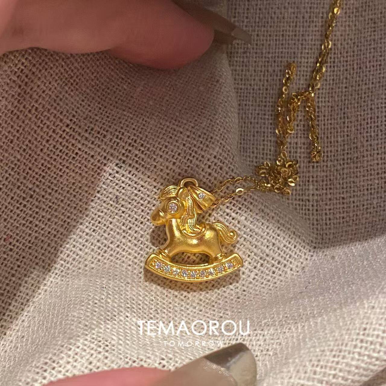 “马上有钱”可爱木马吊坠金色项链新中式复古毛衣链配饰2026新款