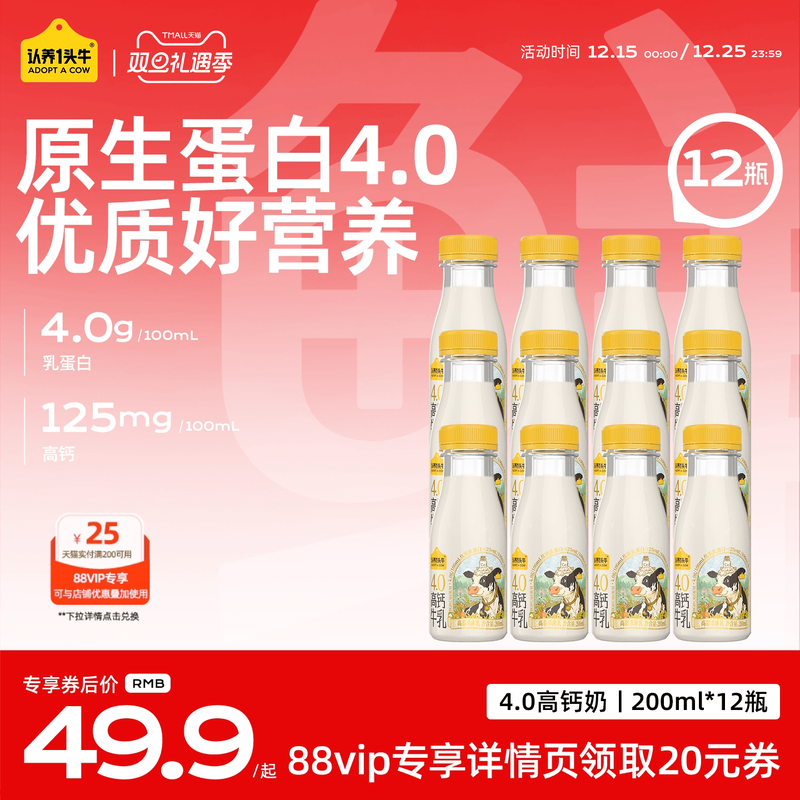 认养一头牛低温冷藏4.0乳蛋白儿童高钙牛奶新鲜牛奶200ml*12瓶