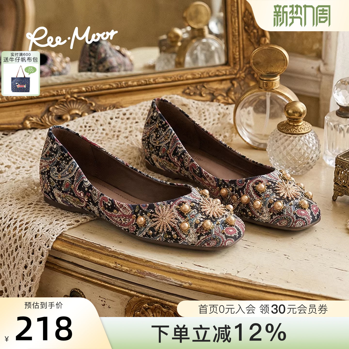REEMOOR睿慕2026春季新款民族风印花浅口单鞋女平底水钻珍珠