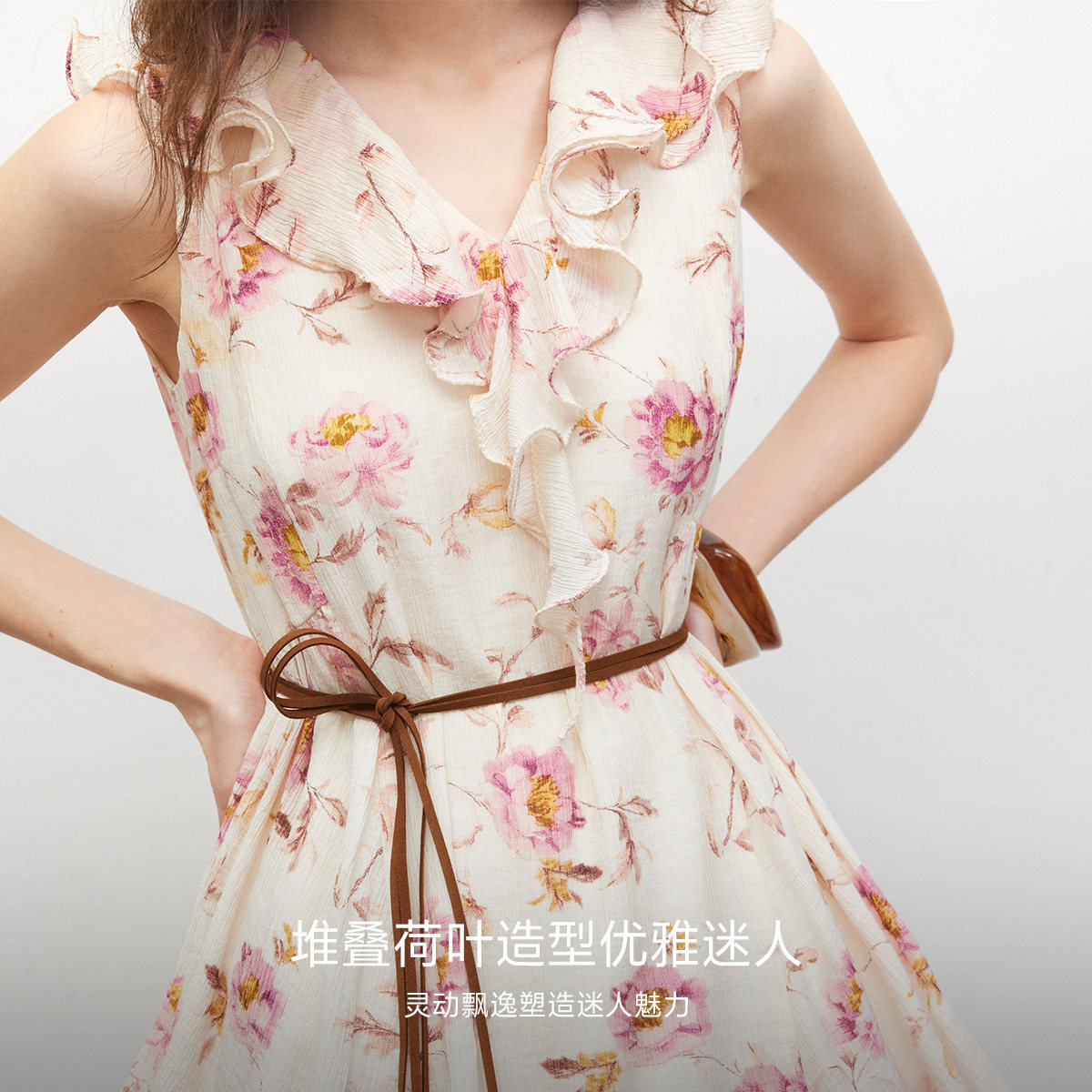 浪漫花束印花,灵动荷叶边领口