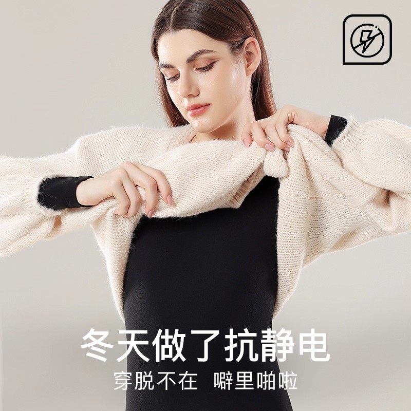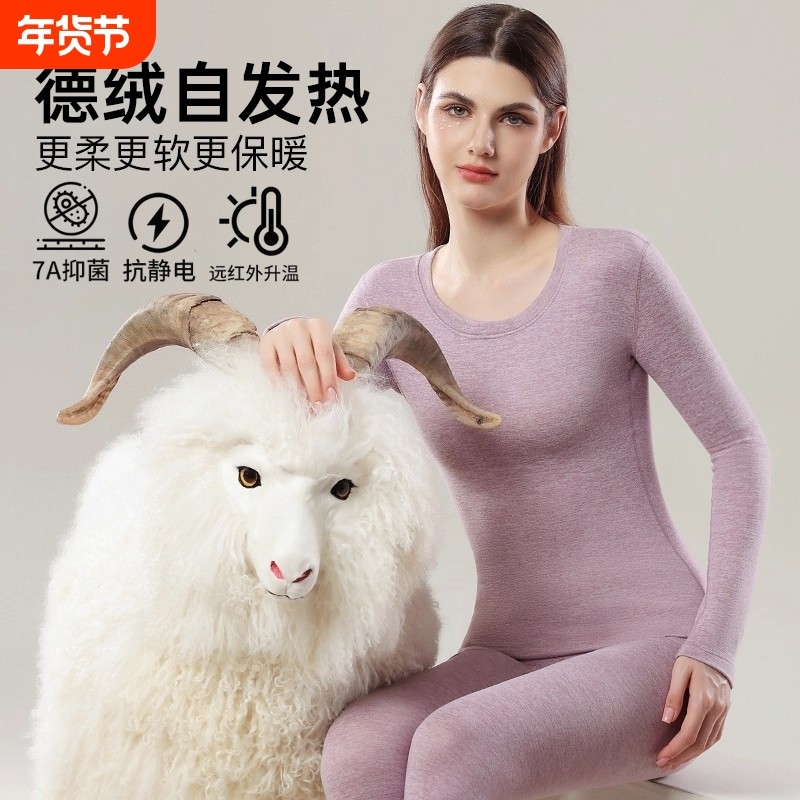 羊毛保暖内衣女蚕丝秋冬季德绒发热加绒加厚打底秋衣秋裤套装紫色