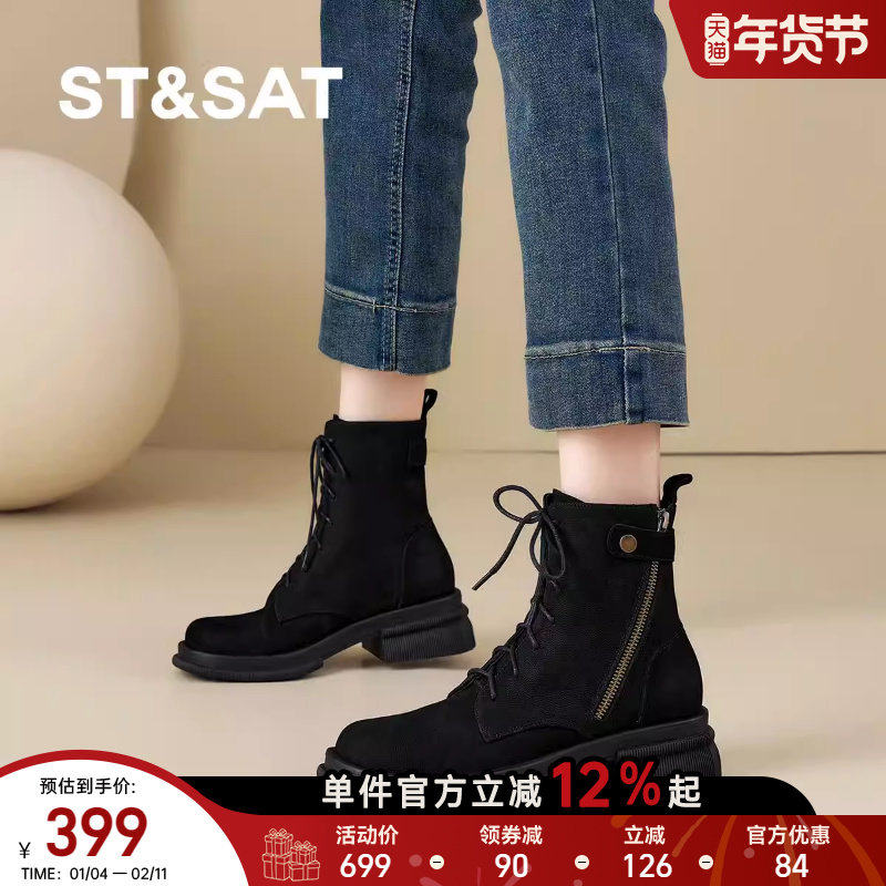 星期六2025新款黑色系带短靴女厚底马丁靴皮带扣机车靴厚底瘦瘦靴