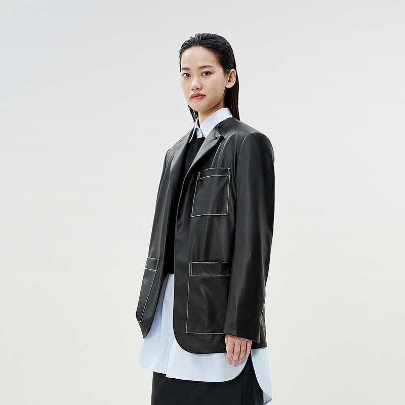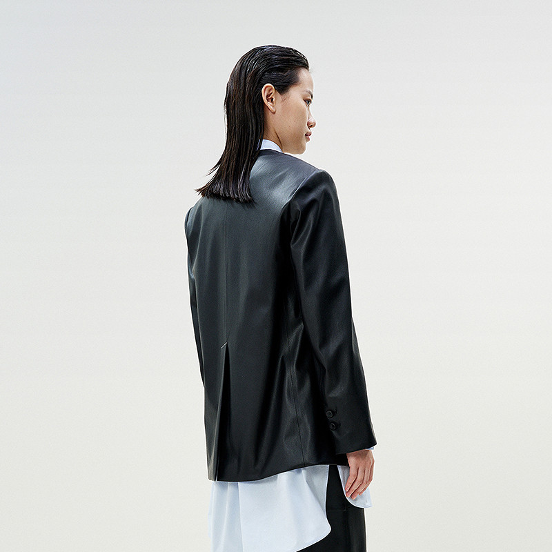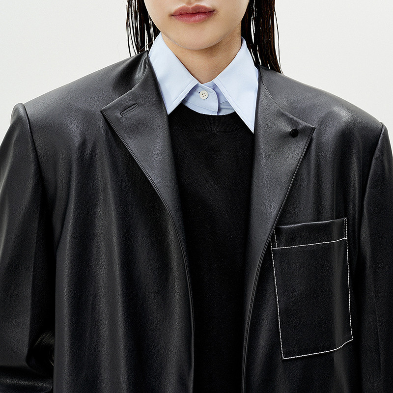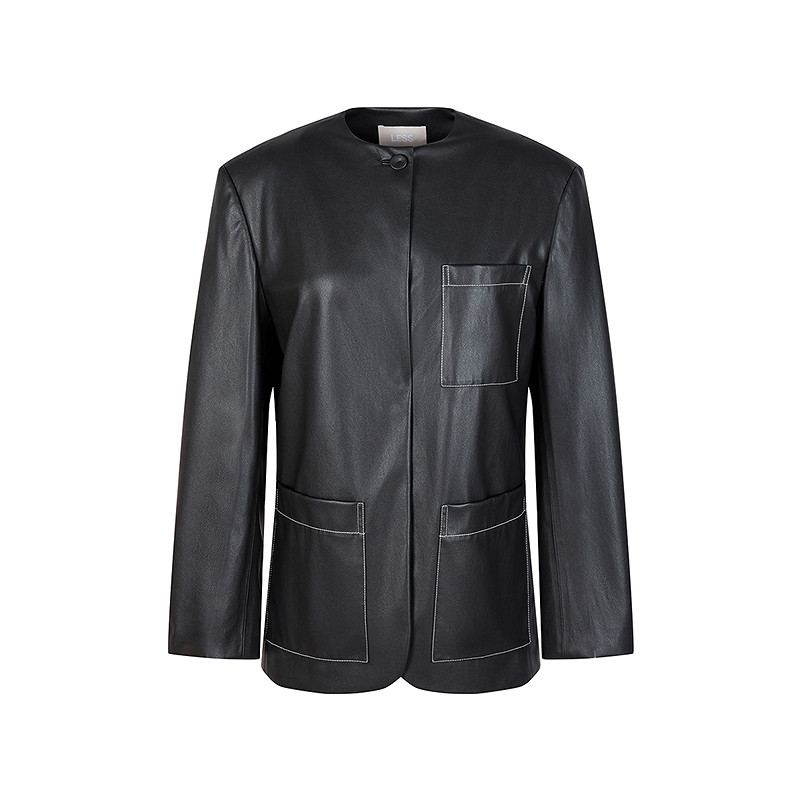 LESS春工装直筒简约时尚舒适夹克通勤黑色PU皮衣外套女2P2A10790