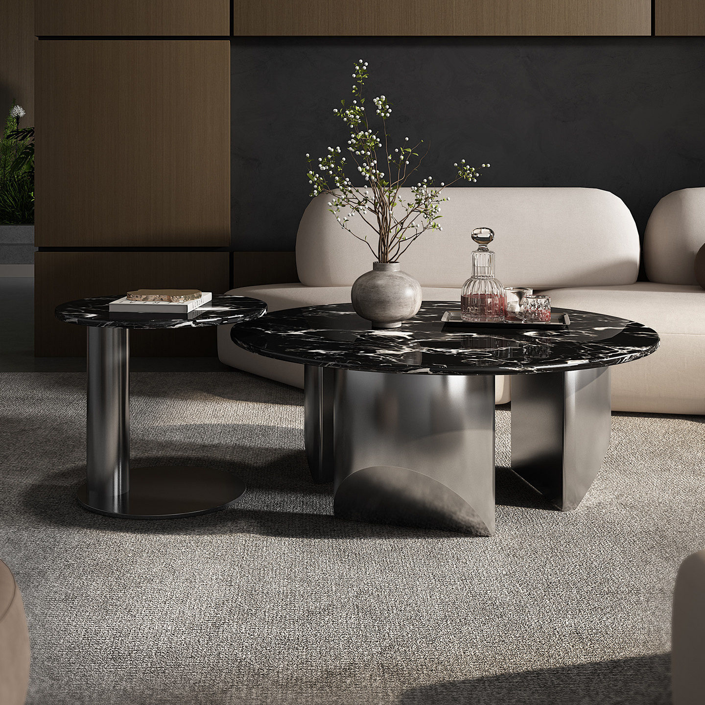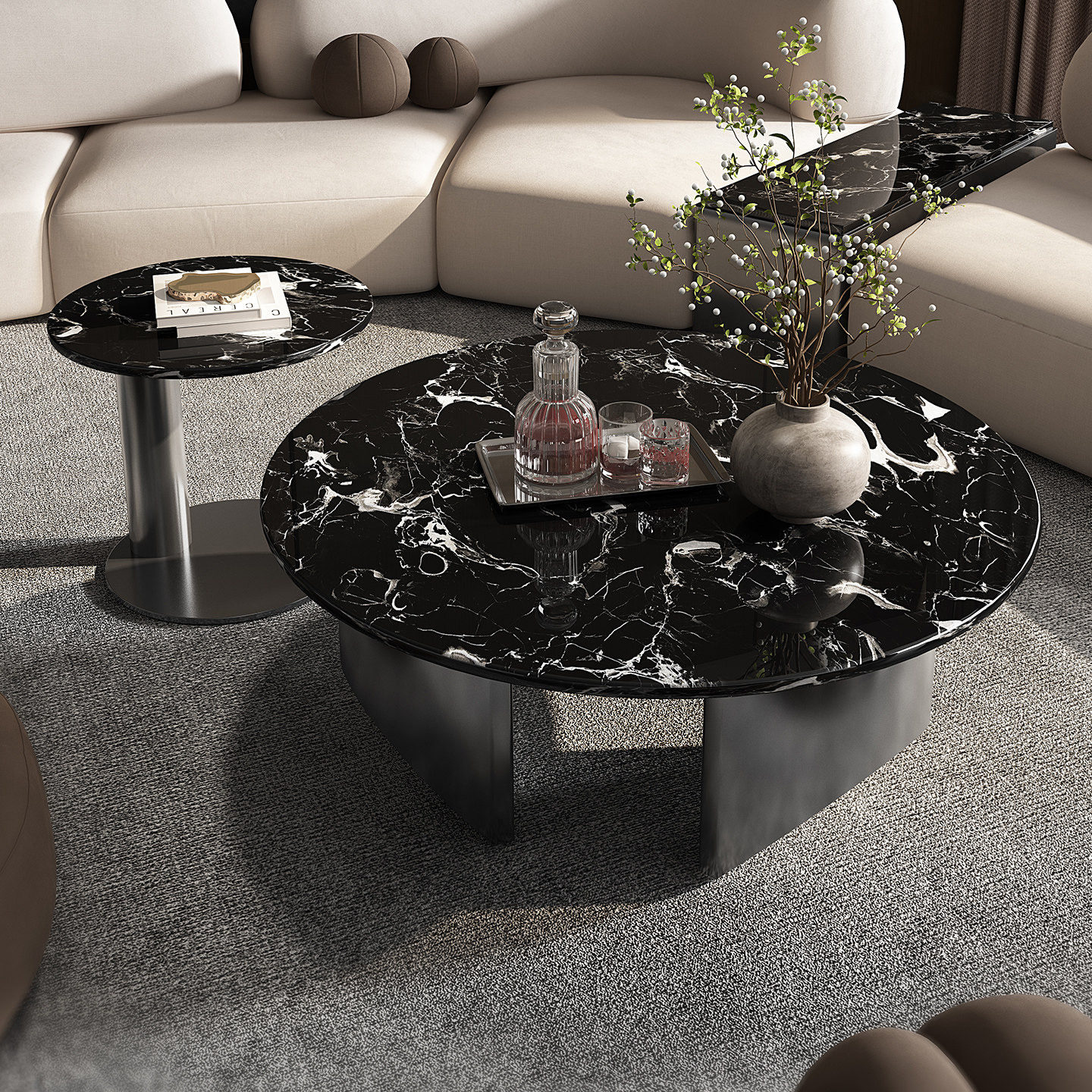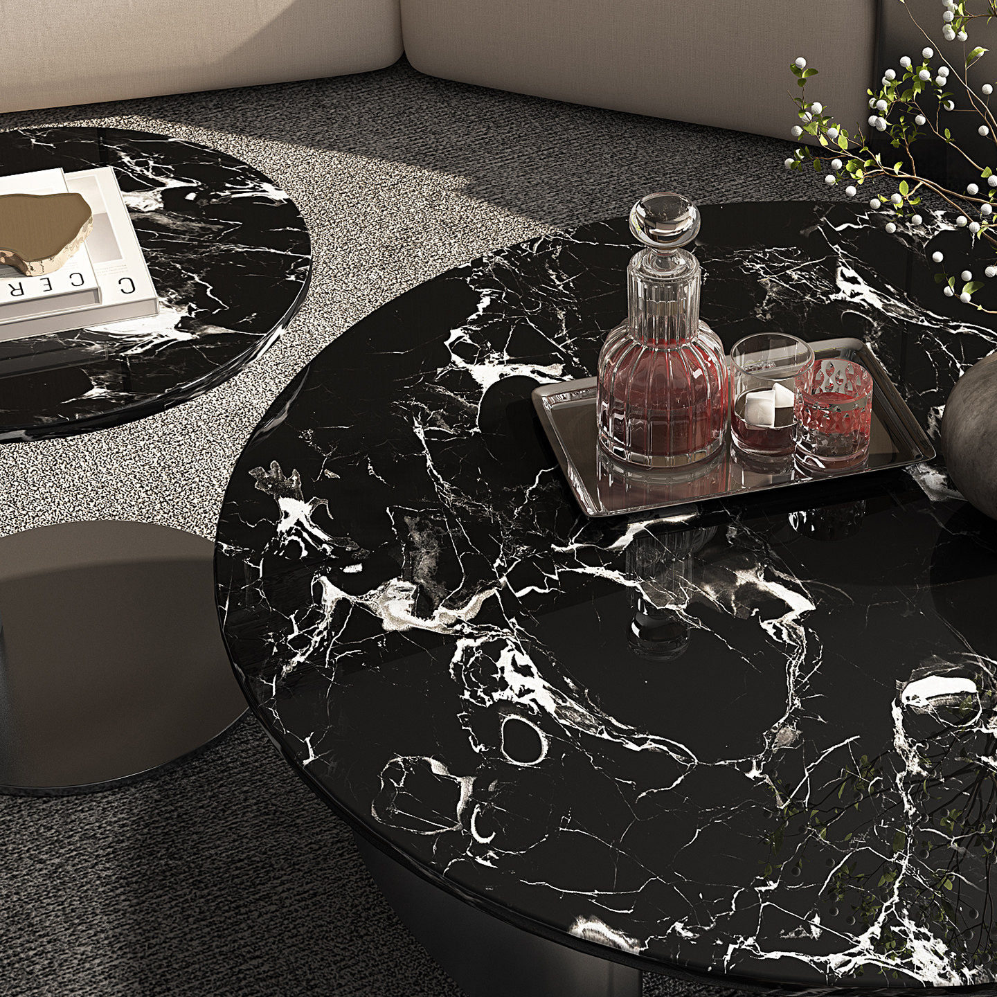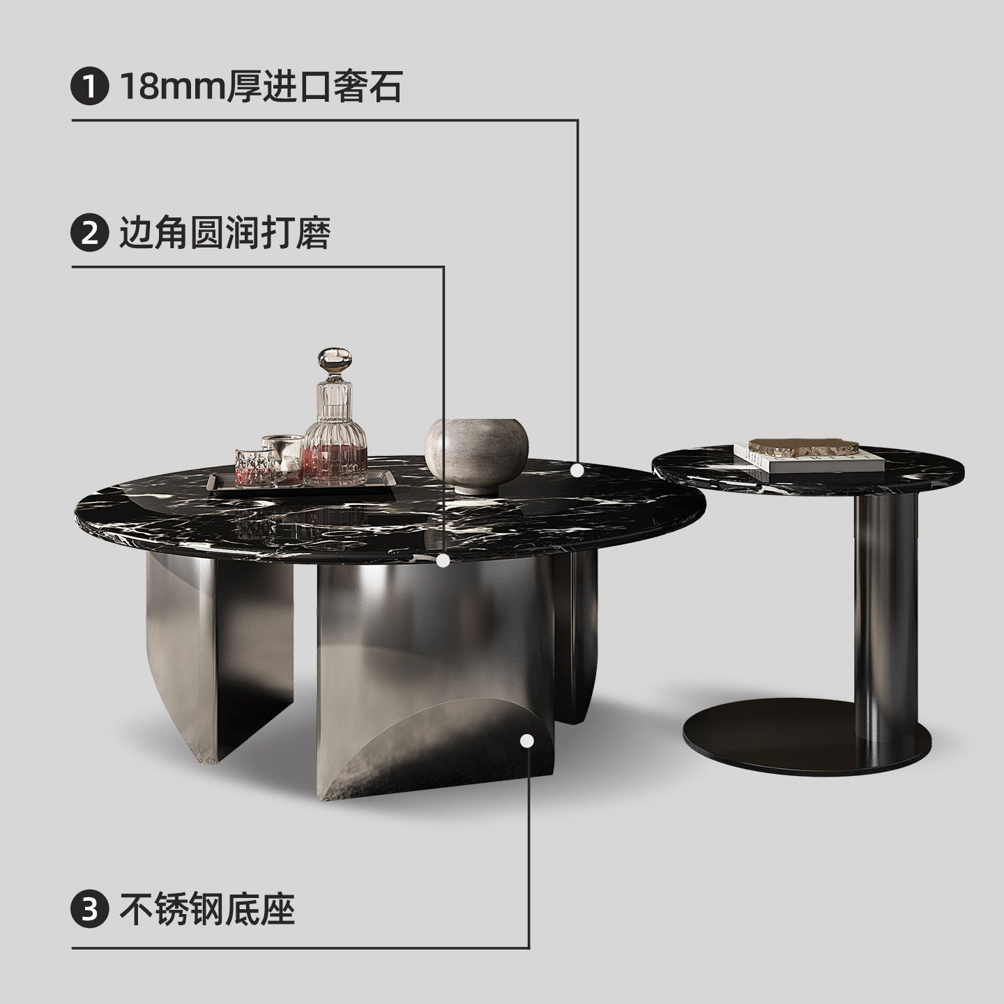 意式茶几2026新款轻奢高级感天然大理石黑玫瑰圆形大小圆茶几组合