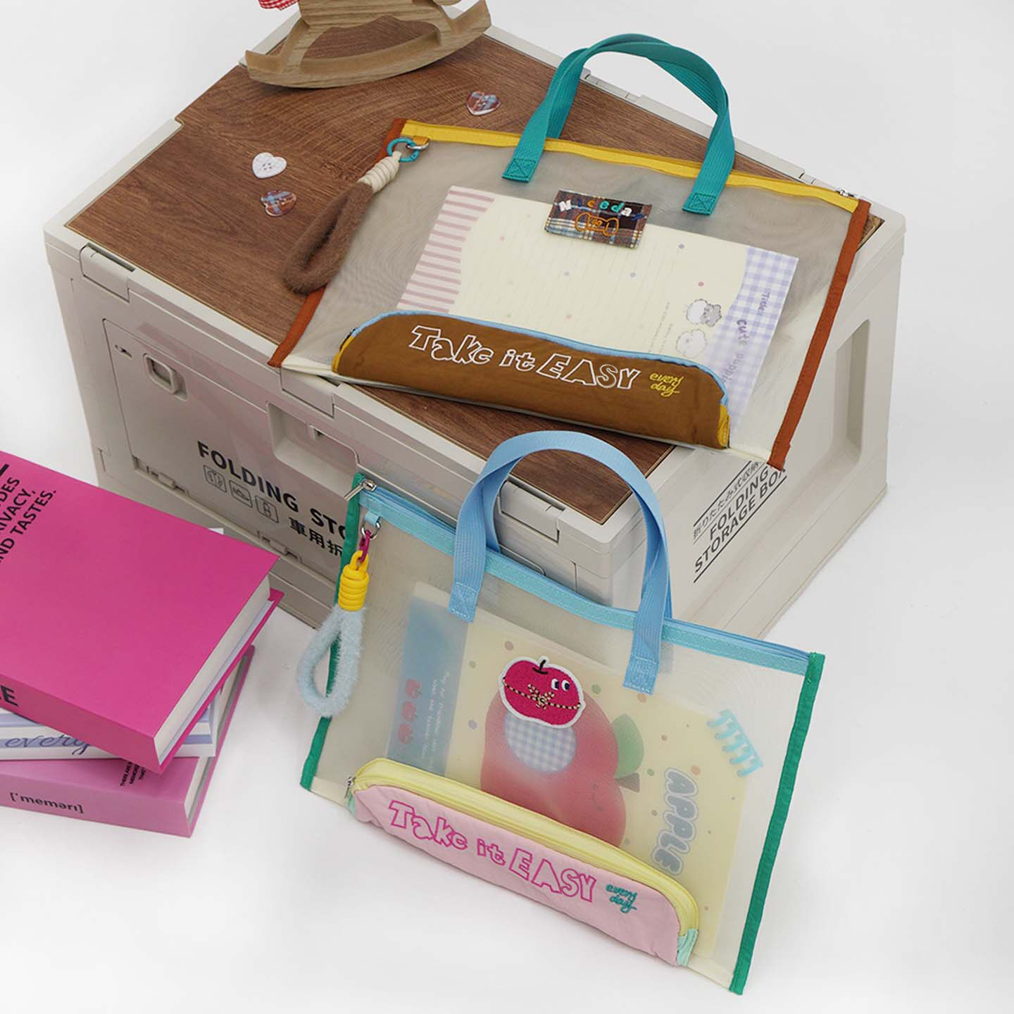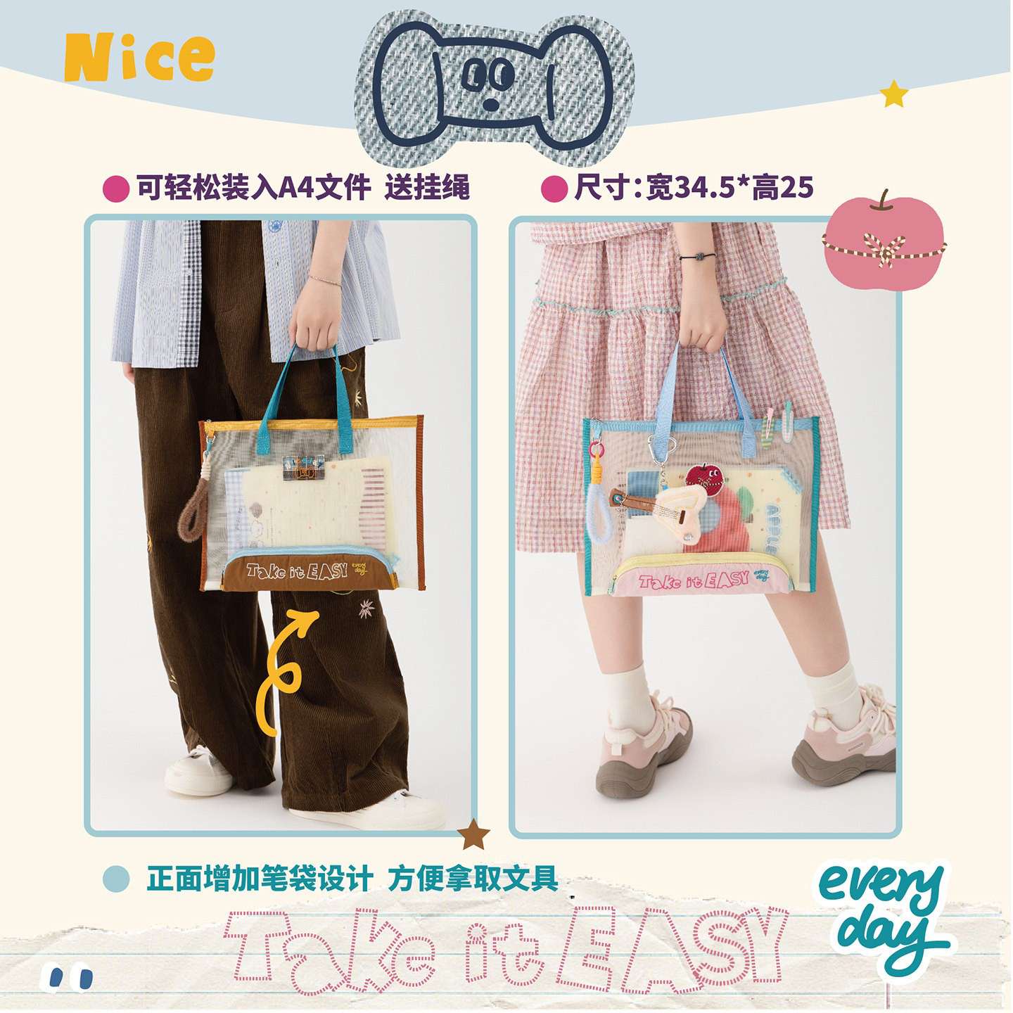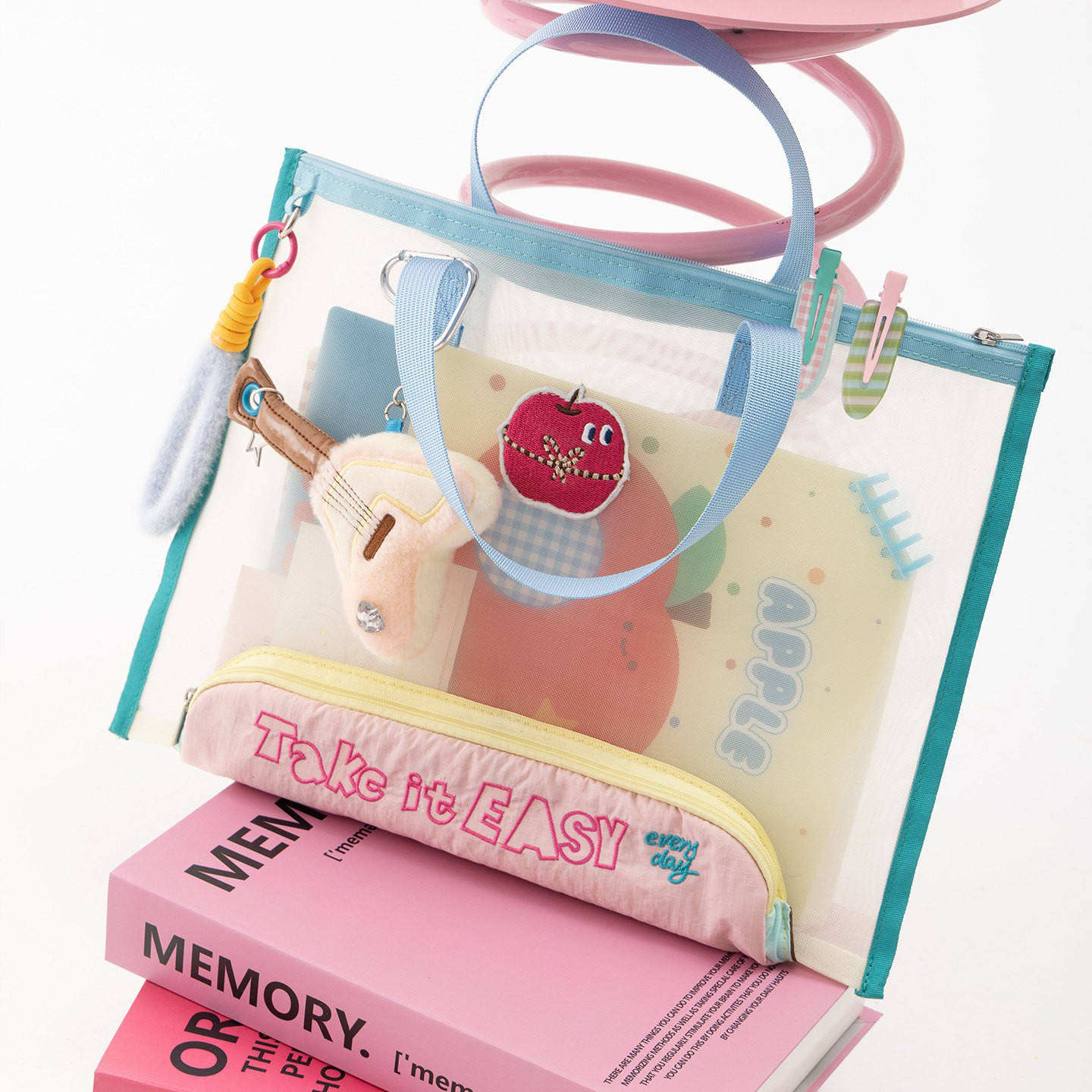L型科目分类袋手提透明文件袋拉链式网纱大开口学生拎书袋考试