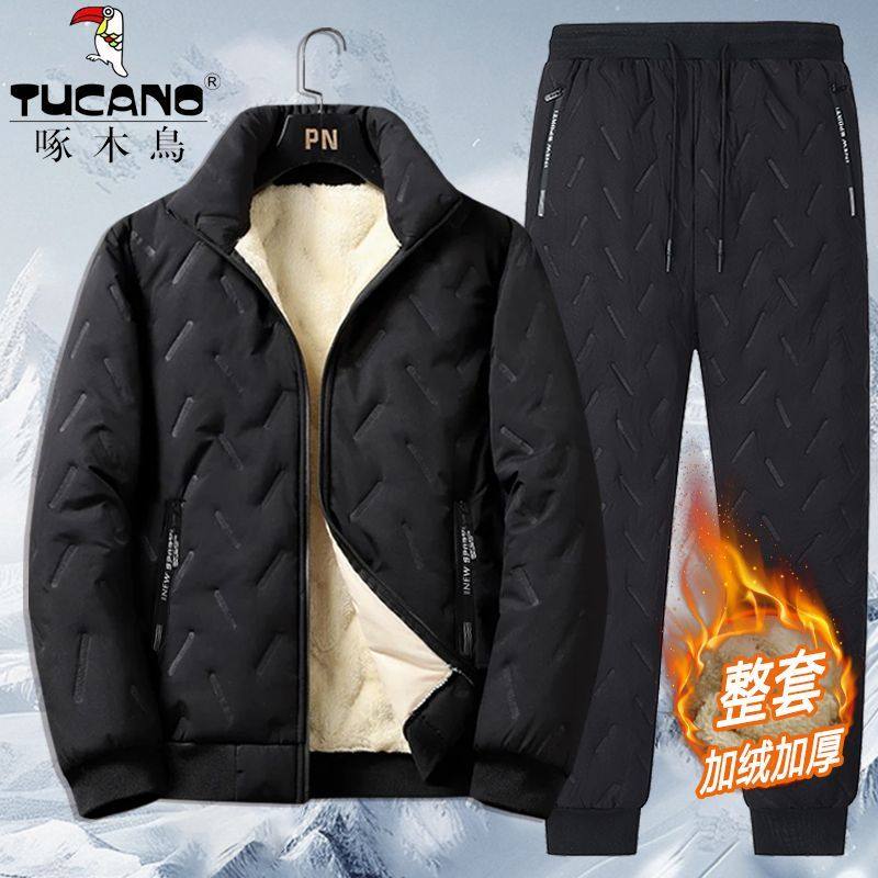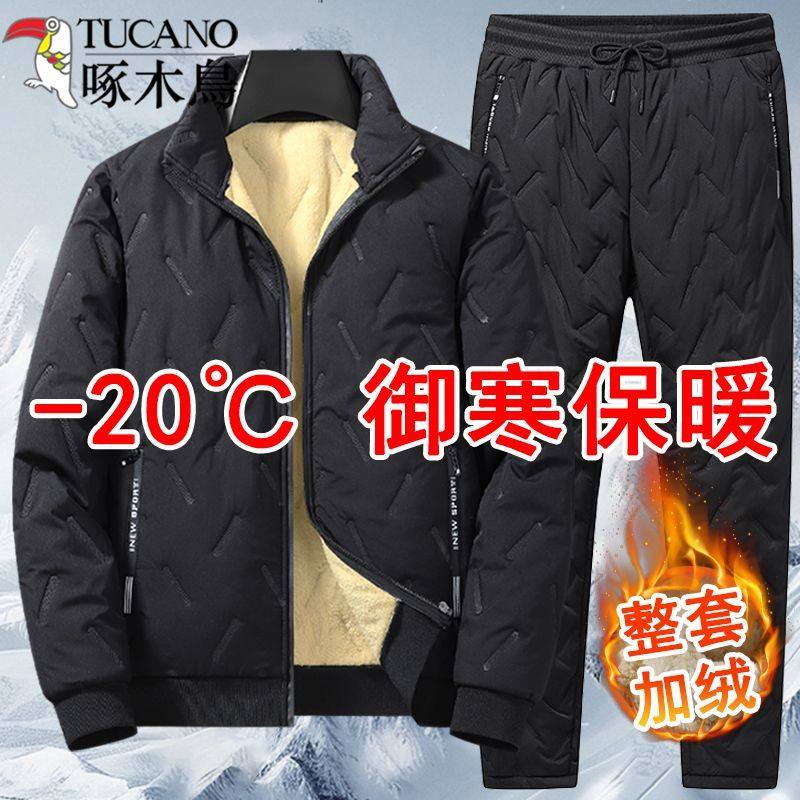 啄木鸟羊羔绒棉衣套装男士加绒加厚防寒服棉衣棉裤一整套装男冬季