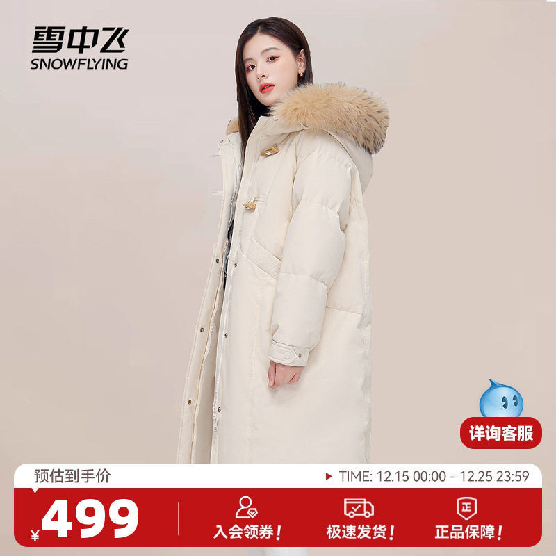 雪中飞2025秋冬爆款时尚连帽宽松H版型牛角扣毛领女士长款羽绒服
