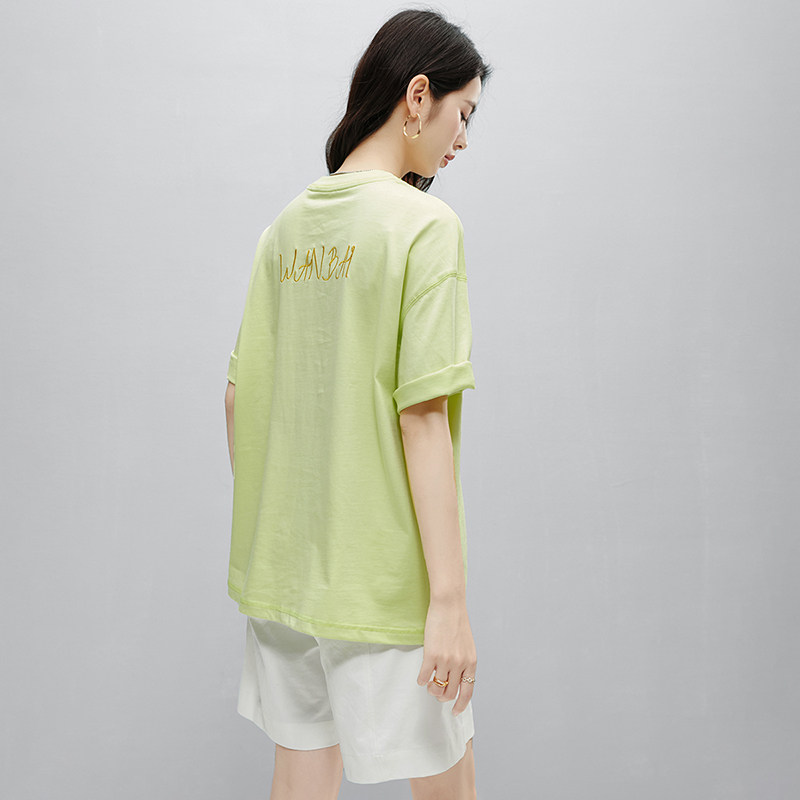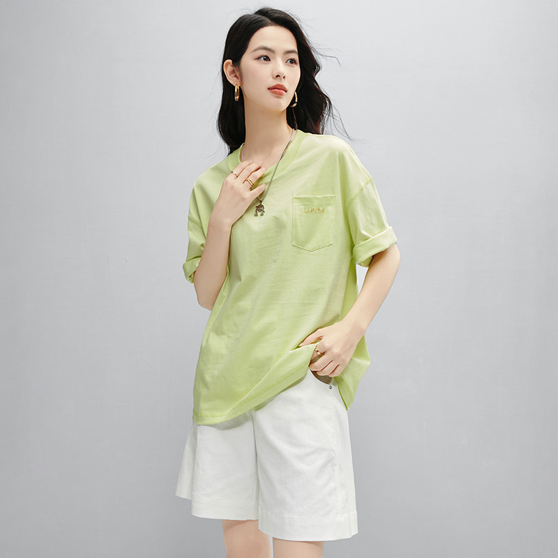 晚白2026年春新款简约圆领落肩上衣全棉宽松休闲短袖T恤衫女