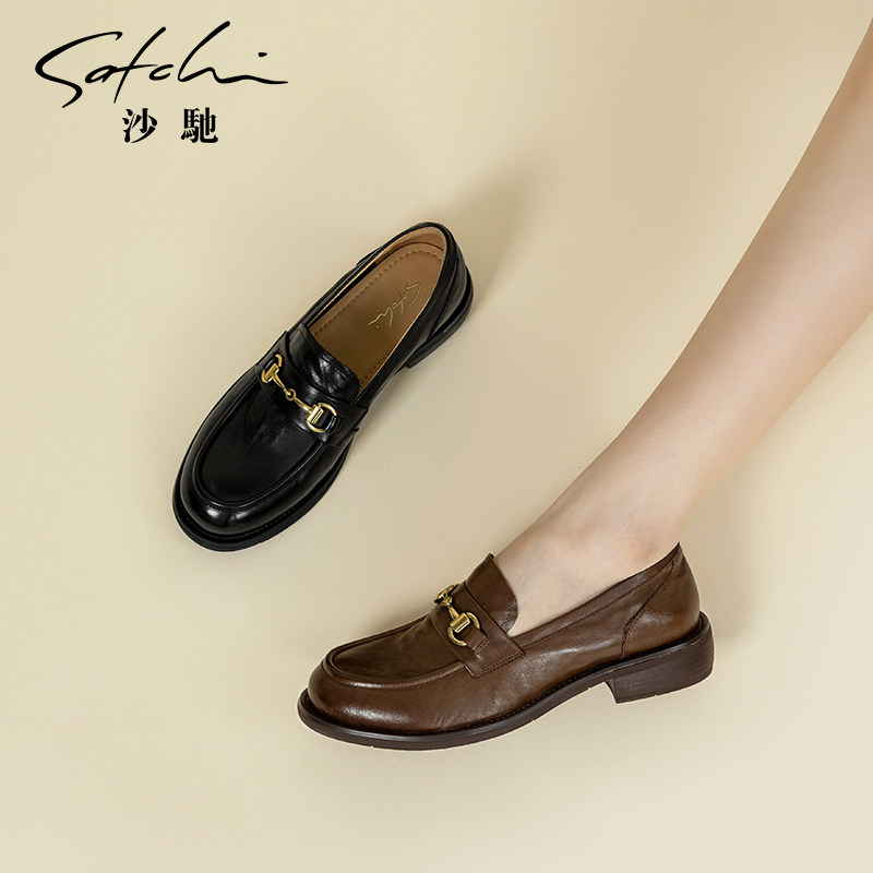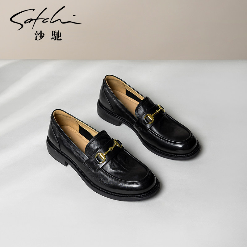 沙驰女鞋一脚蹬厚底乐福鞋单鞋女2026新款马衔扣深口通勤小皮鞋子