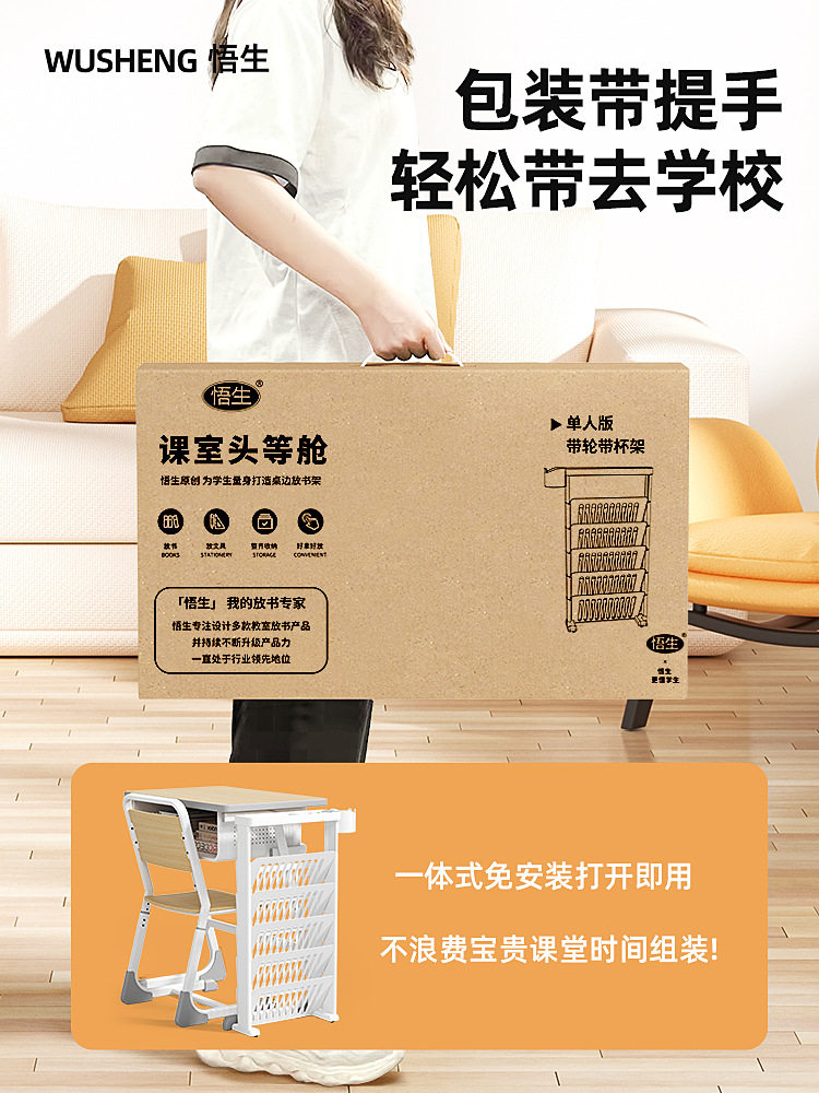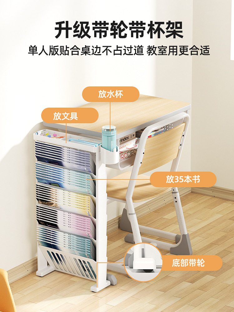 悟生课室带轮课桌收纳神器书本收纳架学生桌边书架可移动教室书桌置物架书箱高中初中书袋挂袋书立架桌面黑色
