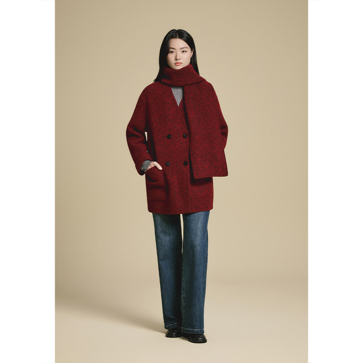 水沐飞高级感酒红色双面羊绒大翻领毛呢大衣女秋冬中长款羊毛外套