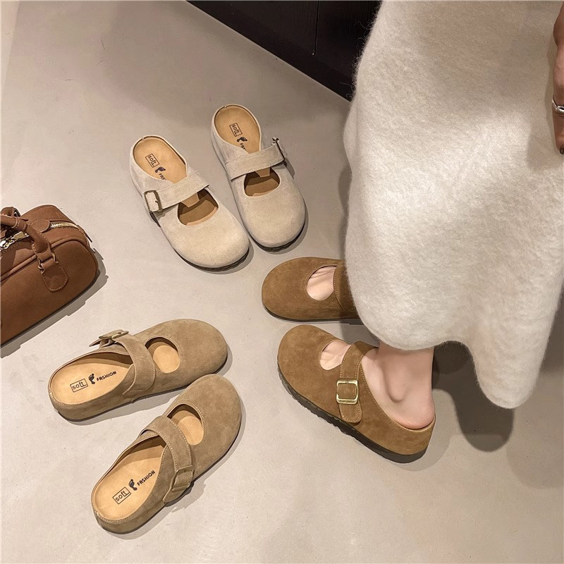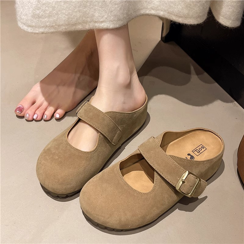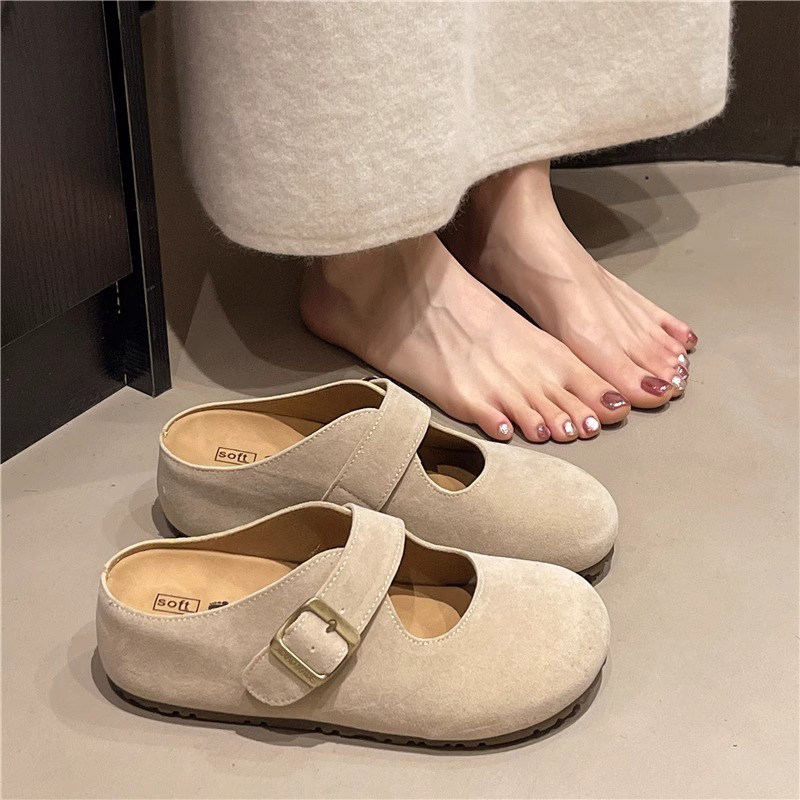 真皮包头拖秋季2025年新款勃肯鞋圆头拖鞋平底外穿休闲半拖懒人鞋