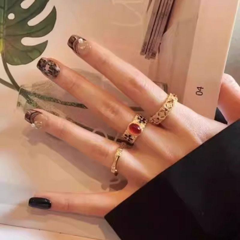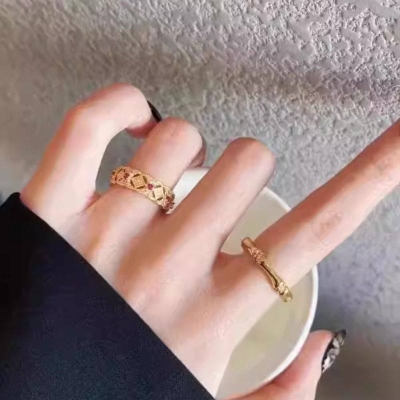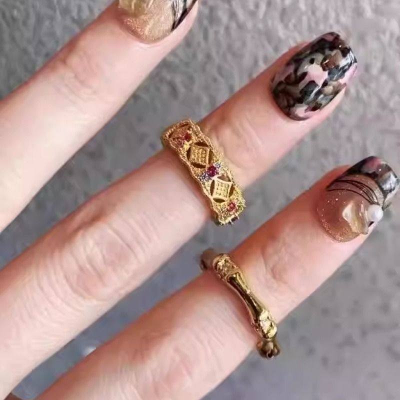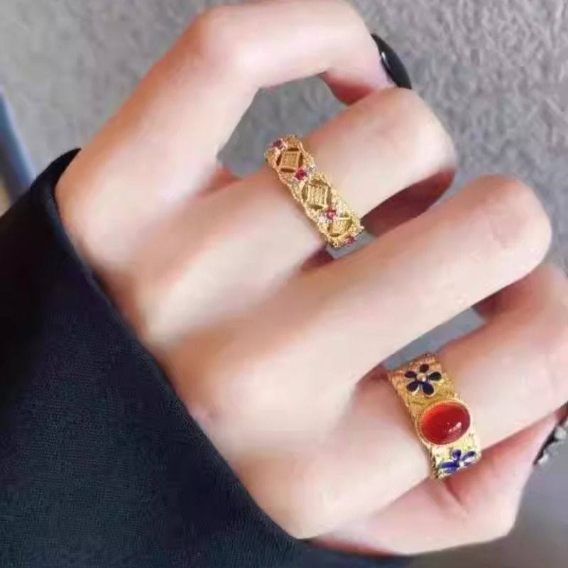 宫廷风复古金色珐琅五叶竹节锆石戒指新中式时尚高级感开口指环