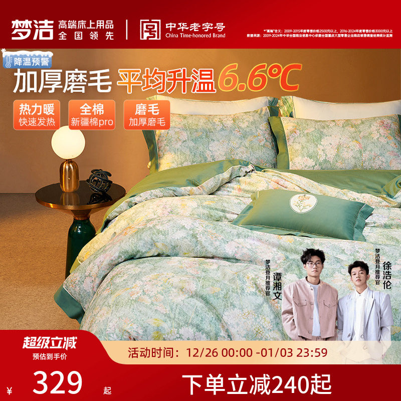 梦洁家纺双面磨毛床上四件套纯棉全棉秋冬季加厚保暖被套被单床品