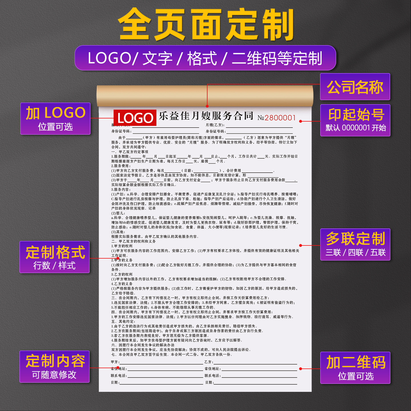 【月嫂专用服务合同】定制二联母婴育婴师预定雇佣协议护理工上门保洁验收单据家政公司钟点工陪护收费派工单