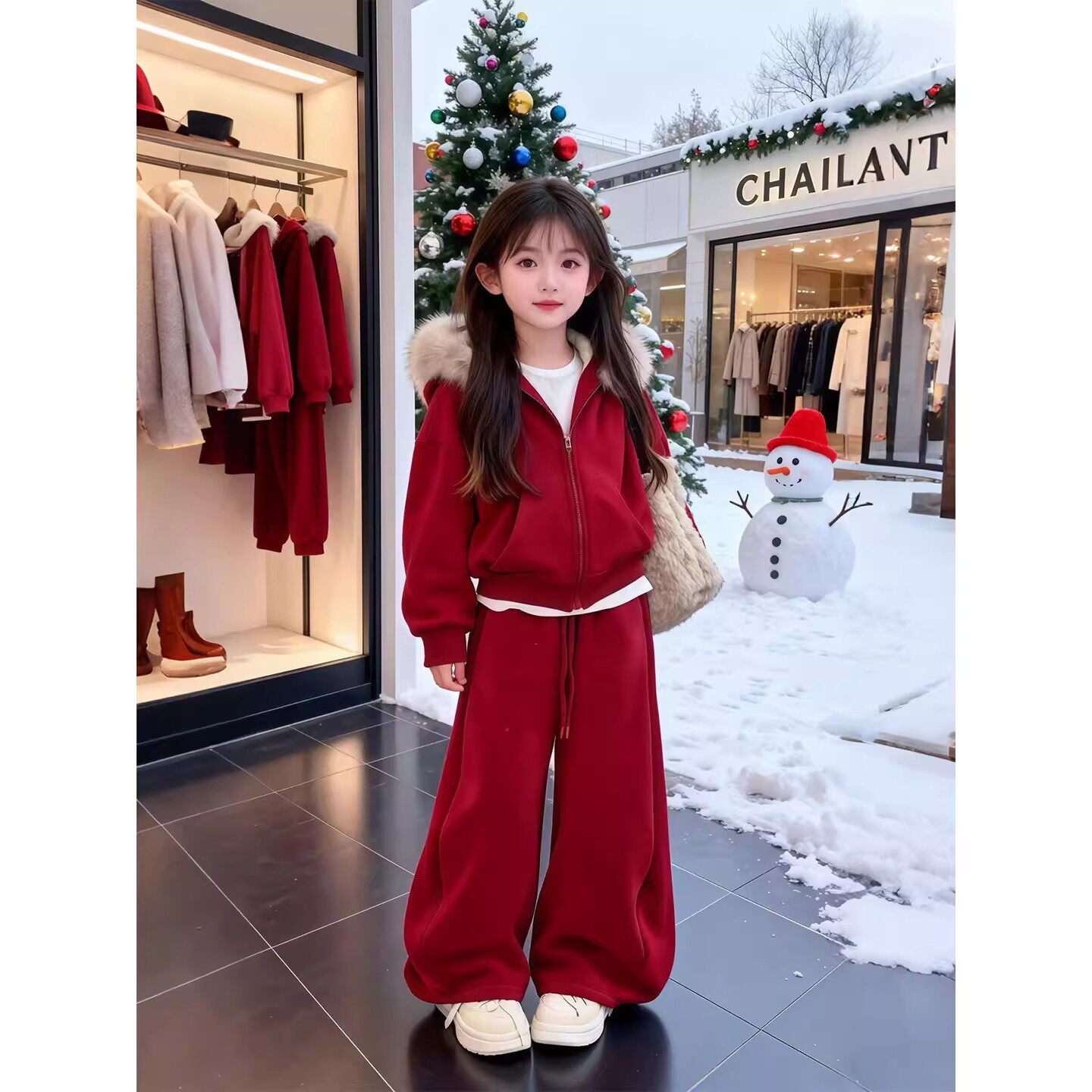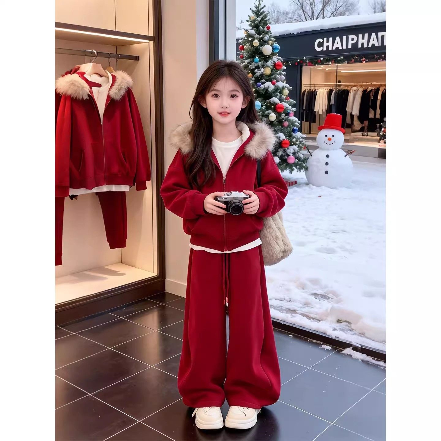 女童冬装加绒红色两件套韩版洋气2026新款中大童保暖套装拜年服