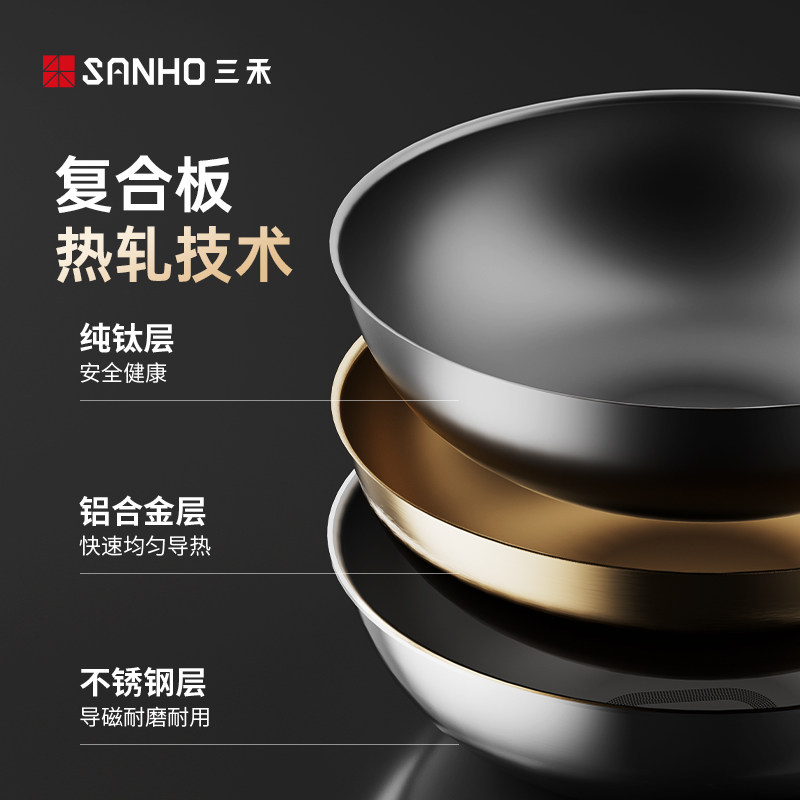 三禾0涂层100%纯钛板材不粘炒锅家用无涂层电磁炉燃气通用不锈钢