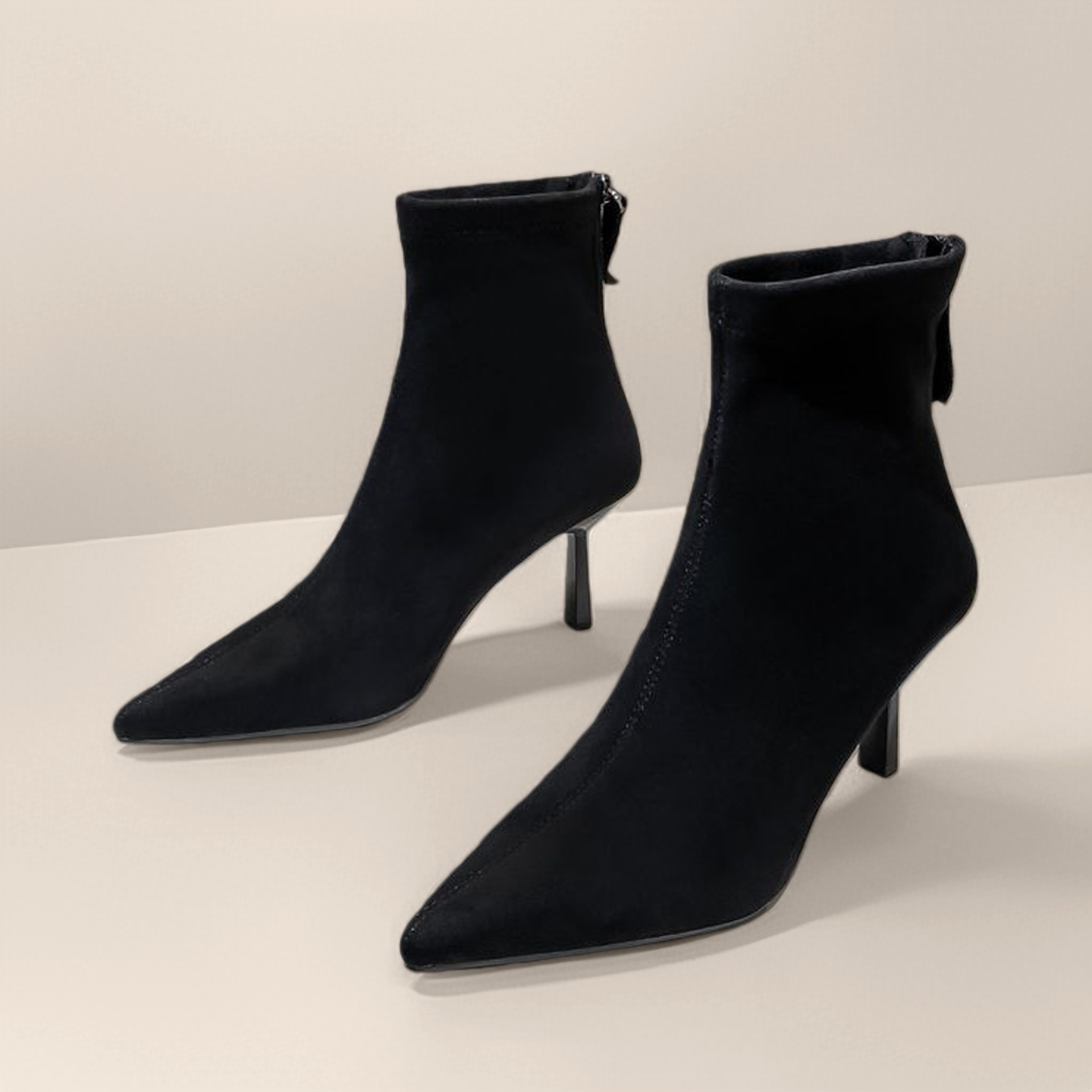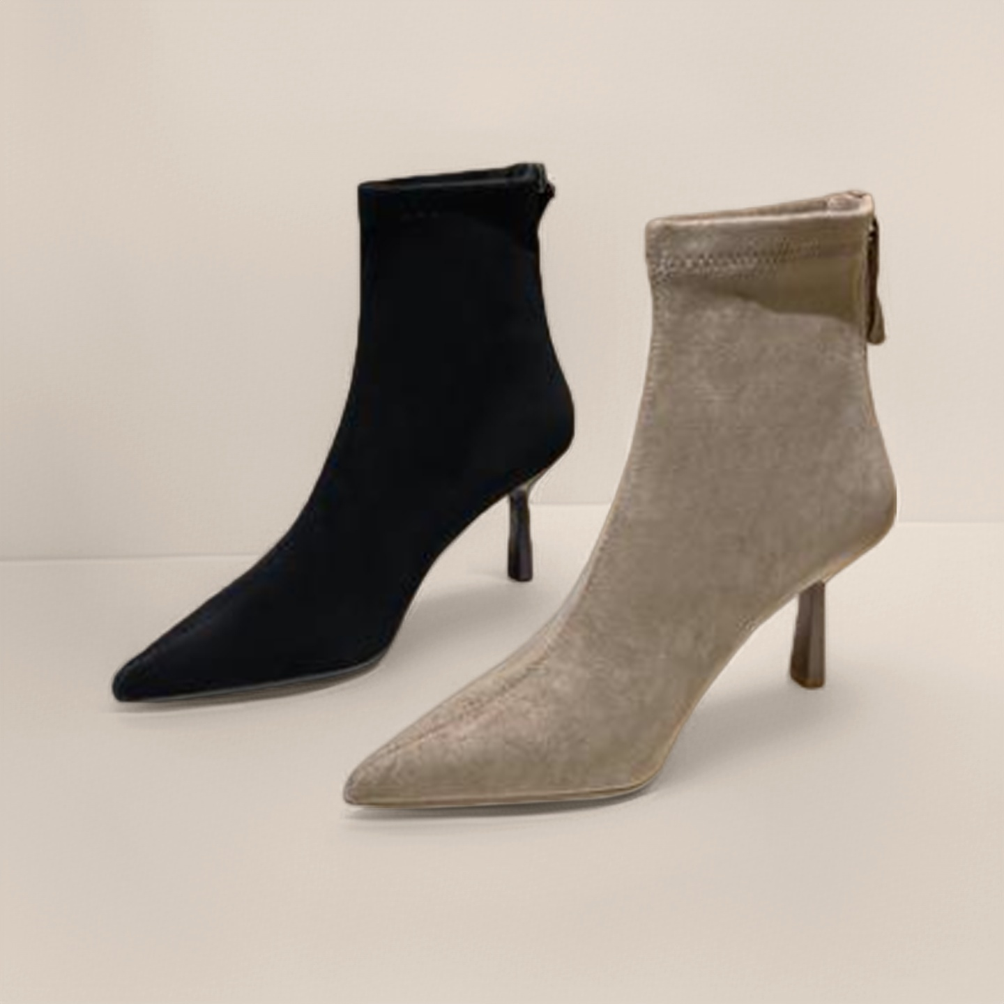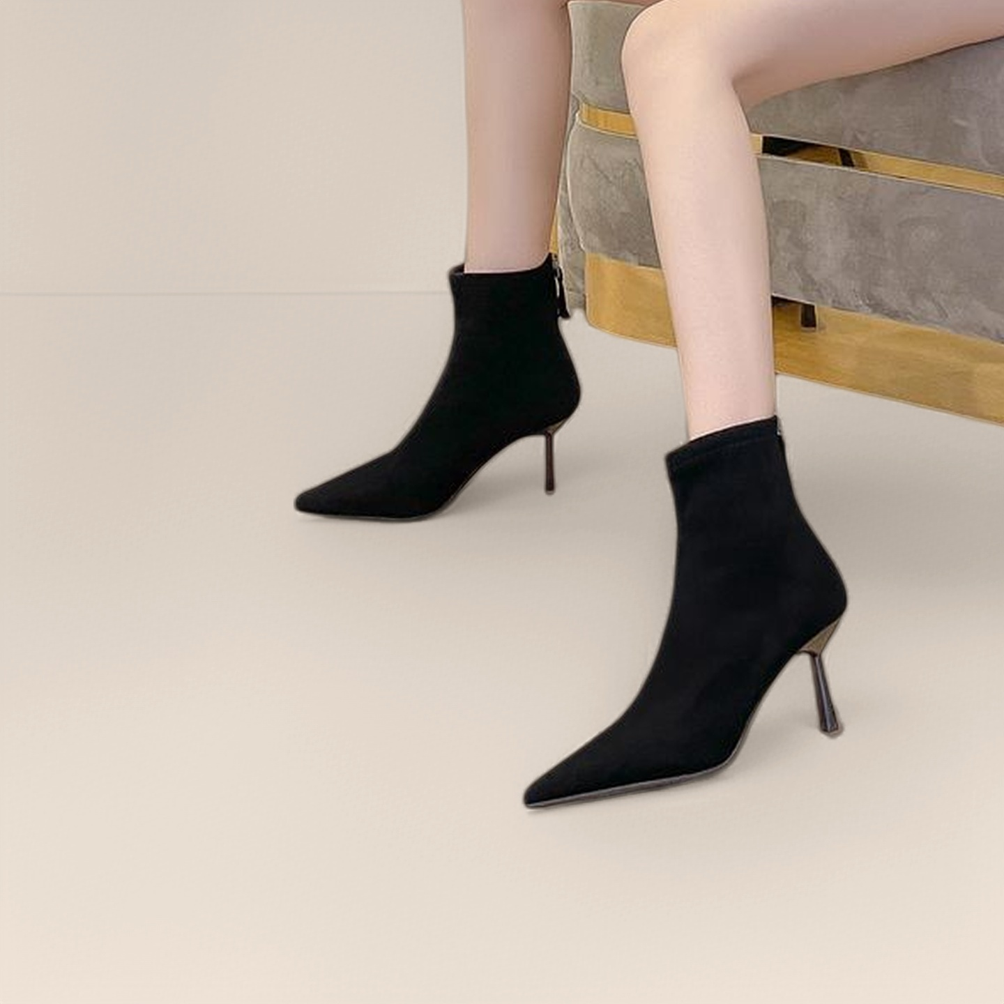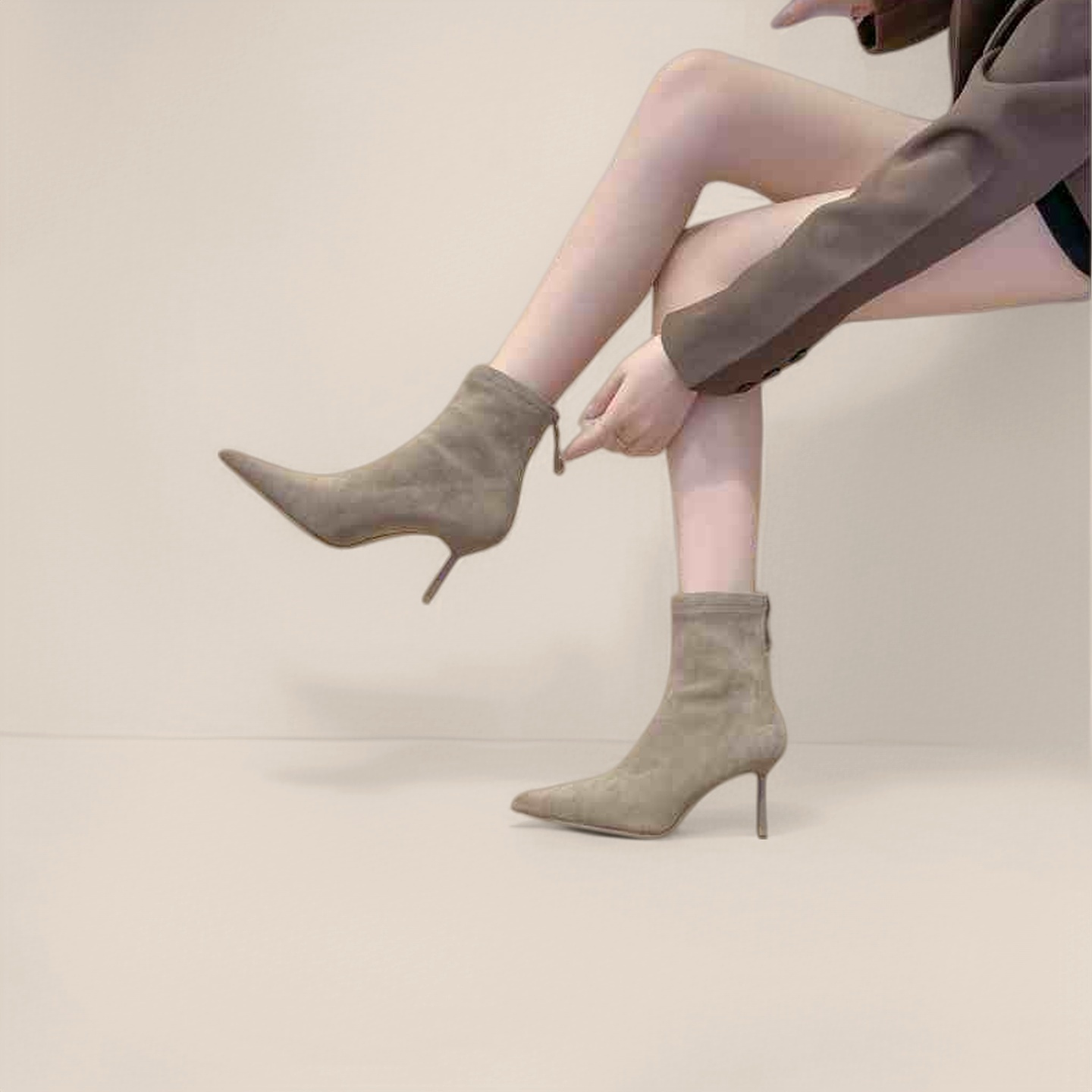 尖头绒面高跟短靴女细跟裸靴2025新款加绒保暖弹力瘦瘦靴女磨砂