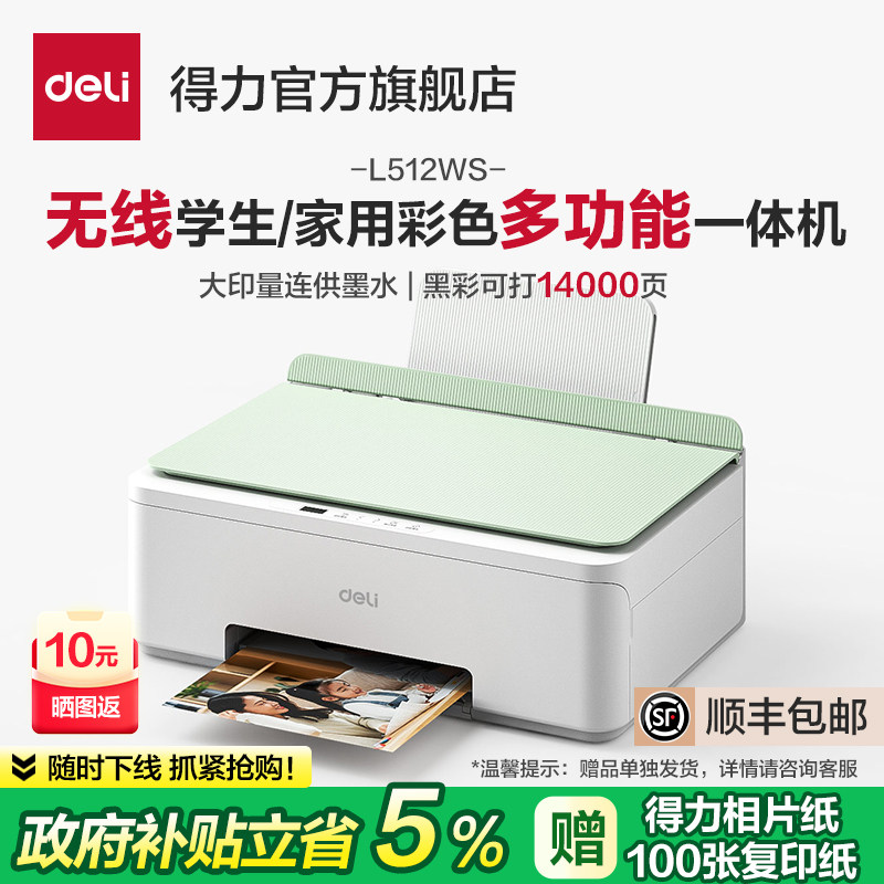 得力L512WS家用打印机小型扫描复印一体机学生打印作业手机连接照片打印连供墨水彩色喷墨打印机政府补贴