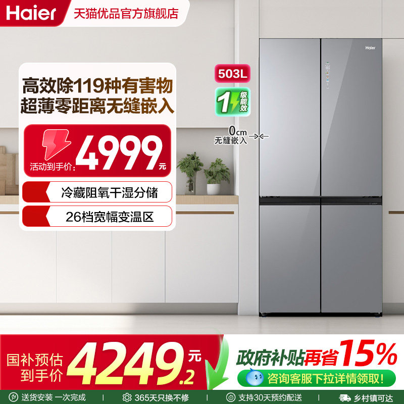 政府补贴海尔出品统帅悦己懒人510十字对开四门超薄一级家用冰箱