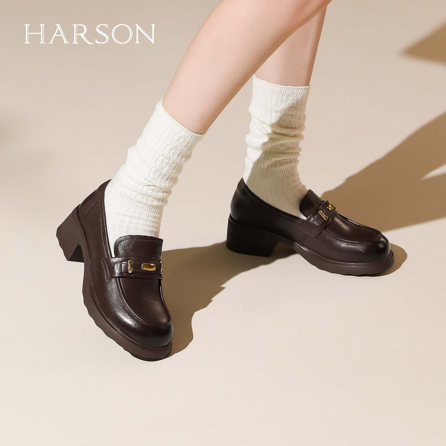 羊皮~棕色山茶花乐福鞋女2025新款通勤粗跟单鞋百搭英伦风小皮鞋