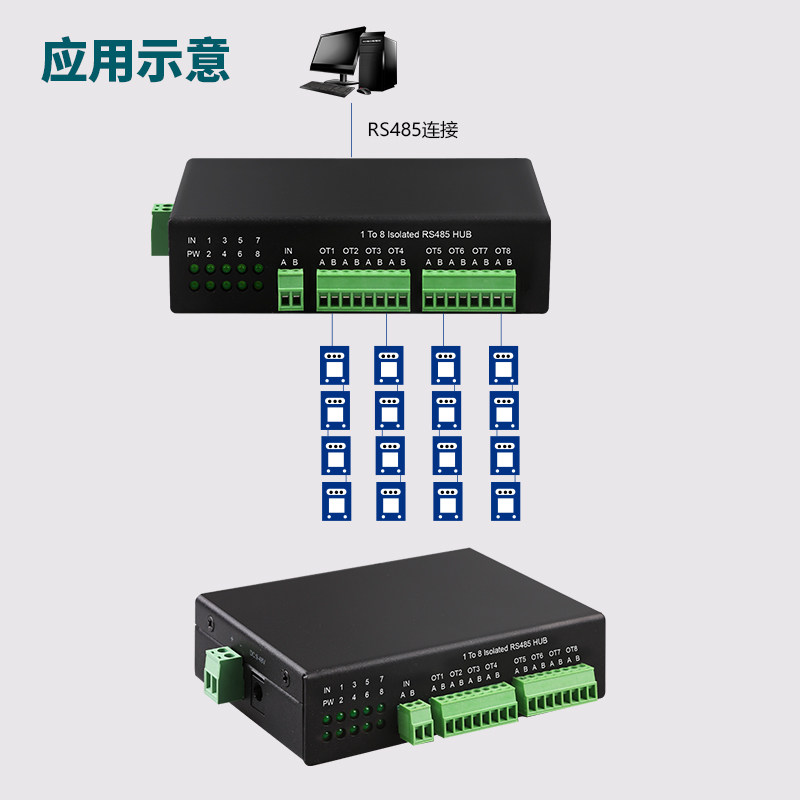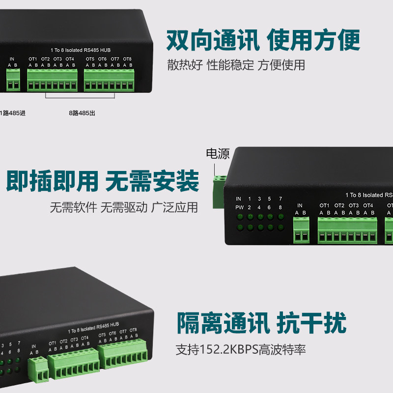 白蜘蛛 工业级隔离型1分8 RS485集线器即插即用双向通讯8路RS485集线16口8位串行输出集线器
