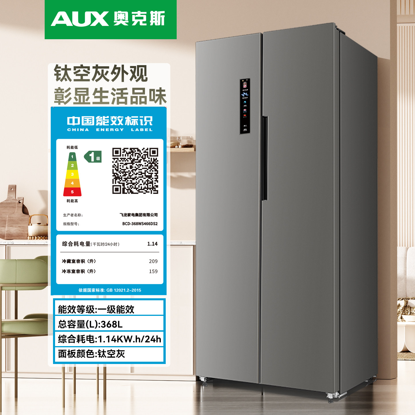 奥克斯大容量十字对开双开门风冷无霜超薄嵌入一级节能家用电冰箱