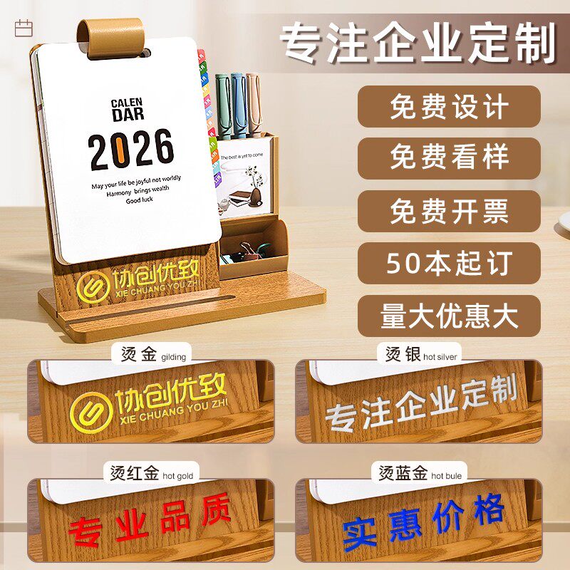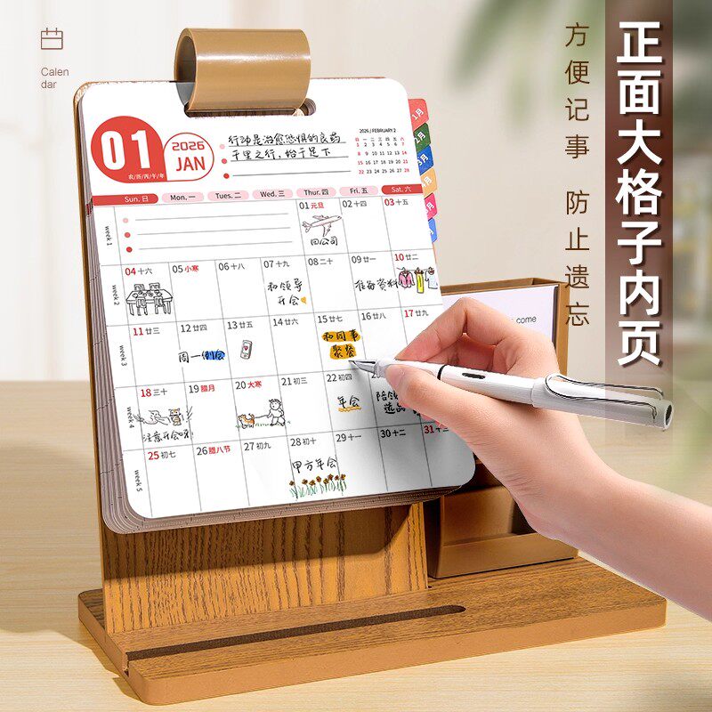 2026年新款日历台历桌面摆件马年创意木质笔筒商务办公室工作自律打卡计划本定制logo2025月历桌面收纳记事本