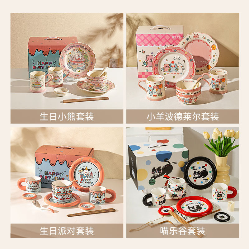 奶油风陶瓷碗家用卡通菜盘子可爱米饭碗汤碗釉下彩儿童餐具耐高温