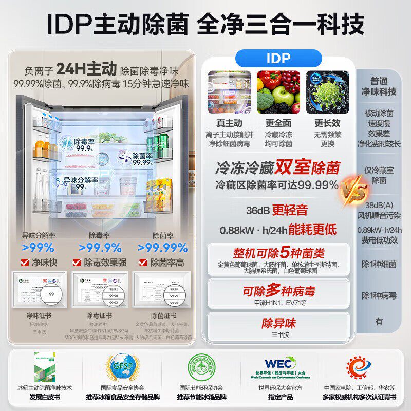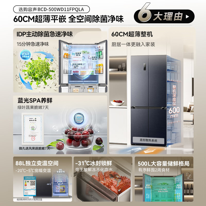 容声500升十字四门超薄零嵌IDP双净一级能效电冰箱