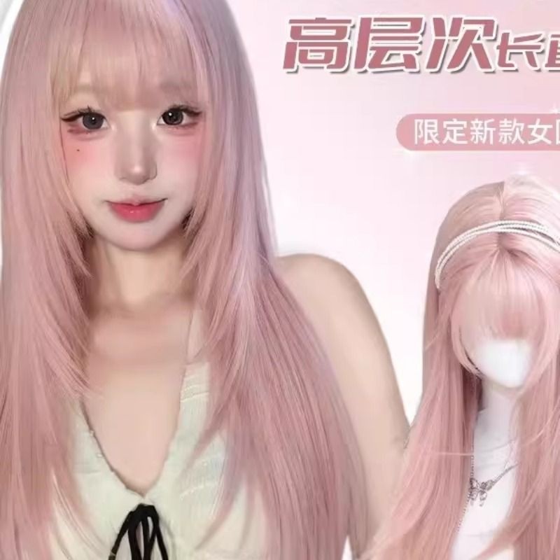 假发女长发粉色假发樱花粉高层次感长直发自然蓬松全头套