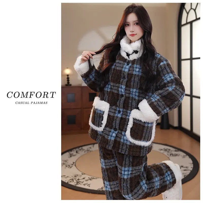 三层夹棉睡衣女款冬季2025新款加厚珊瑚绒纽扣立领女士冬天家居服