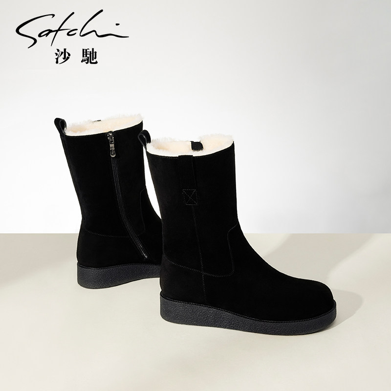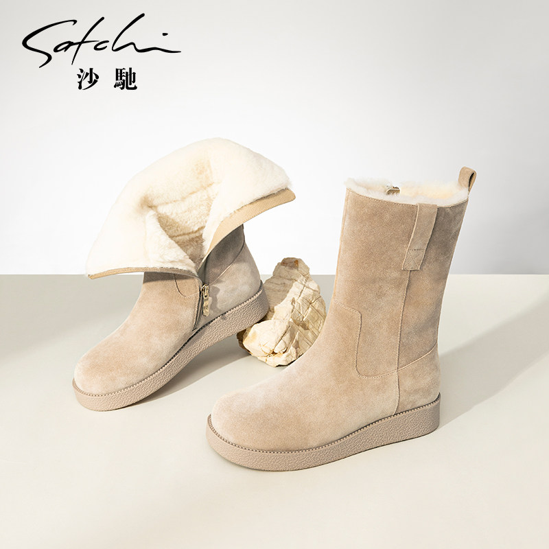 沙驰女鞋厚底东北雪地靴加绒保暖毛毛靴2025年冬季新款时尚中筒靴