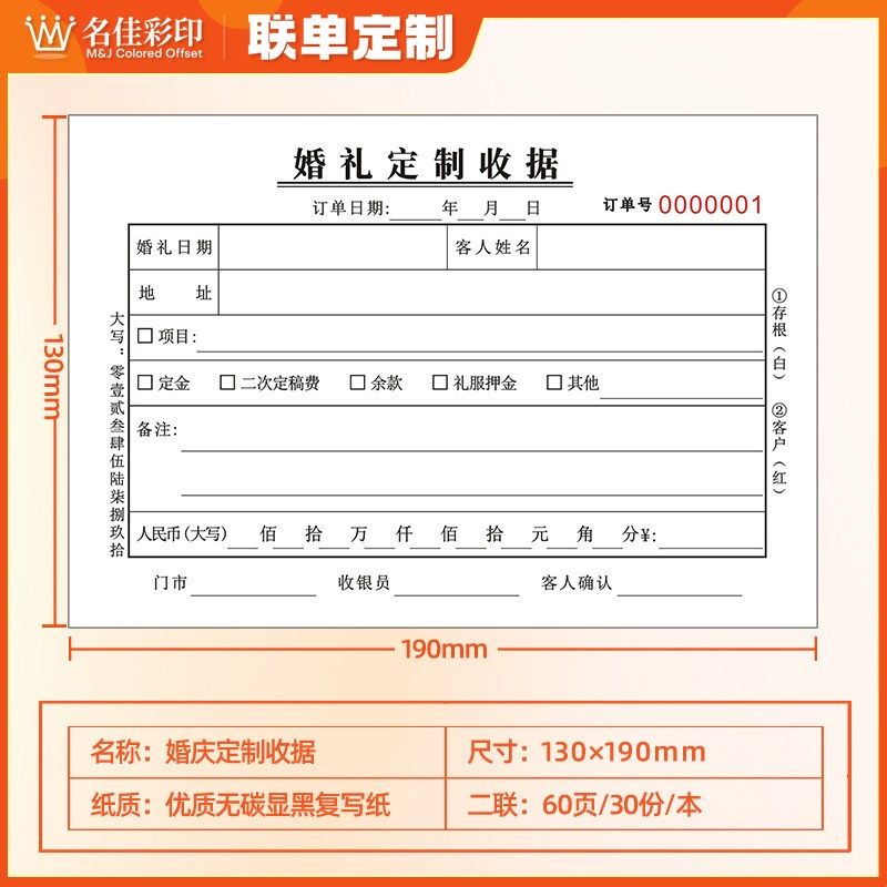 婚庆定制收据二联无碳复写t显黑字婚庆公J司婚礼策划收款收费单订